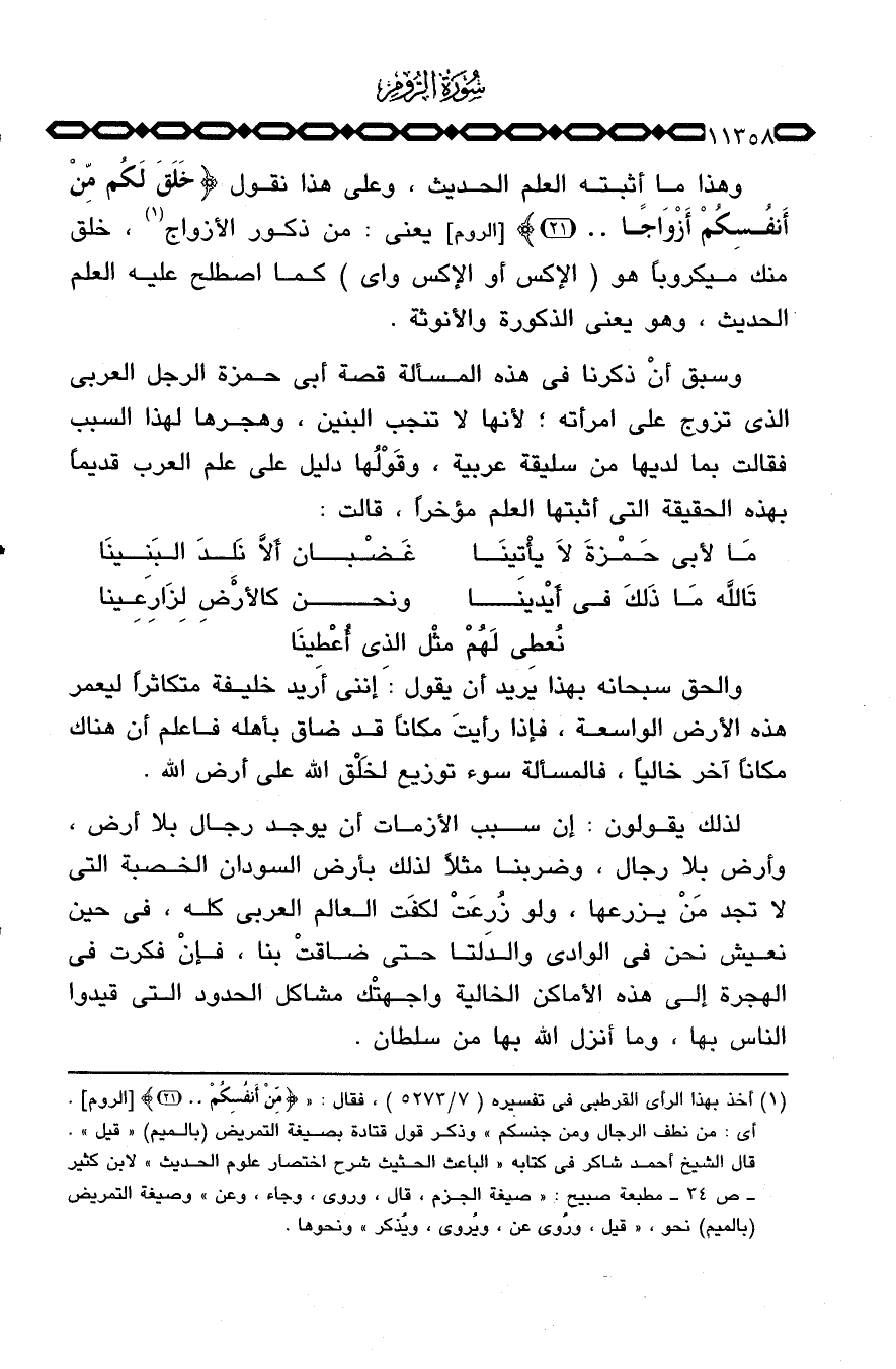 وسبق أنْ ذكرنا في هذه المسألة قصة أبي حمزة الرجل العربي الذي تزوج على امرأته؛ لأنها لا تنجب البنين، وهجرها لهذا السبب فقالت بما لديها من سليقة عربية، وقَوْلُها دليل على علم العرب قديماً بهذه الحقيقة التي أثبتها العلم مؤخراً، قالت: