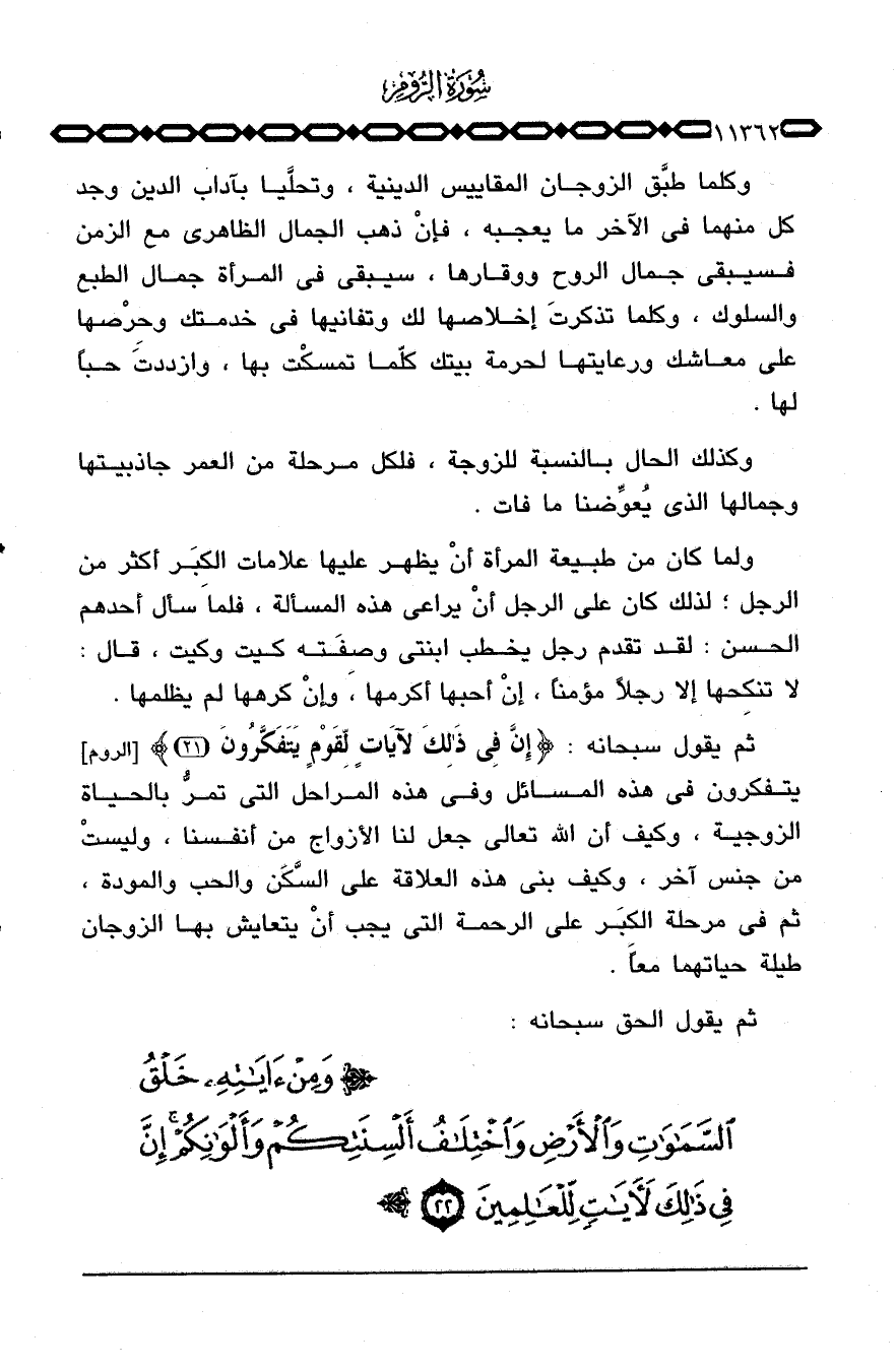 ثم يقول سبحانه: {إِنَّ فِي ذَلِكَ لآيَاتٍ لِّقَوْمٍ يَتَفَكَّرُونَ} [الروم: 21] يتفكرون في هذه المسائل وفي هذه المراحل التي تمرُّ بالحياة الزوجية، وكيف أن الله تعالى جعل لنا الأزواج من أنفسنا، وليستْ من جنس آخر، وكيف بنى هذه العلاقة على السَّكَن والحب والمودة، ثم في مرحلة الكِبَر على الرحمة التي يجب أنْ يتعايش بها الزوجان طيلة حياتهما معاً.