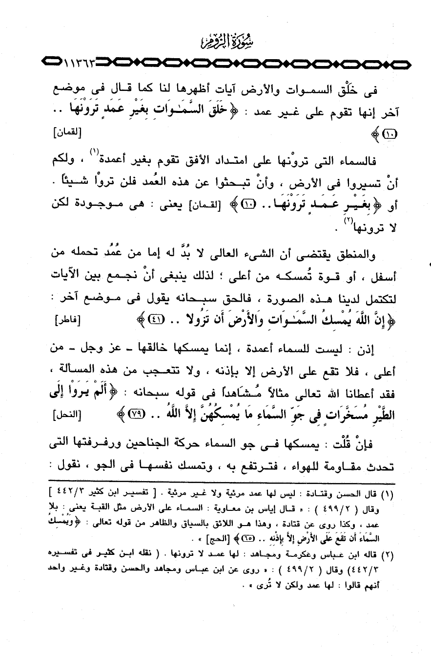 والمنطق يقتضي أن الشيء العالي لا بُدَّ له إما من عُمُد تحمله من أسفل، أو قوة تمسكه من أعلى؛ لذلك ينبغي أنْ نجمع بين الآيات لتكتمل لدينا هذه الصورة، فالحق سبحانه يقول في موضع آخر: {إِنَّ الله يُمْسِكُ السماوات والأرض أَن تَزُولاَ ... } [فاطر: 41] .