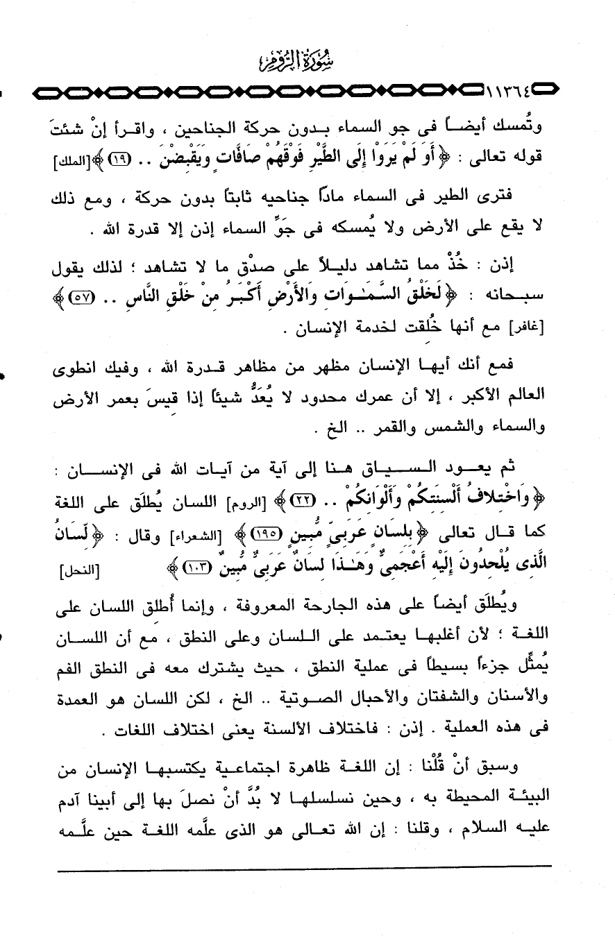 فترى الطير في السماء مادّاً جناحيه ثابتاً بدون حركة، ومع ذلك لا يقع على الأرض ولا يُمسكه في جَوِّ السماء إذن إلا قدرة الله.