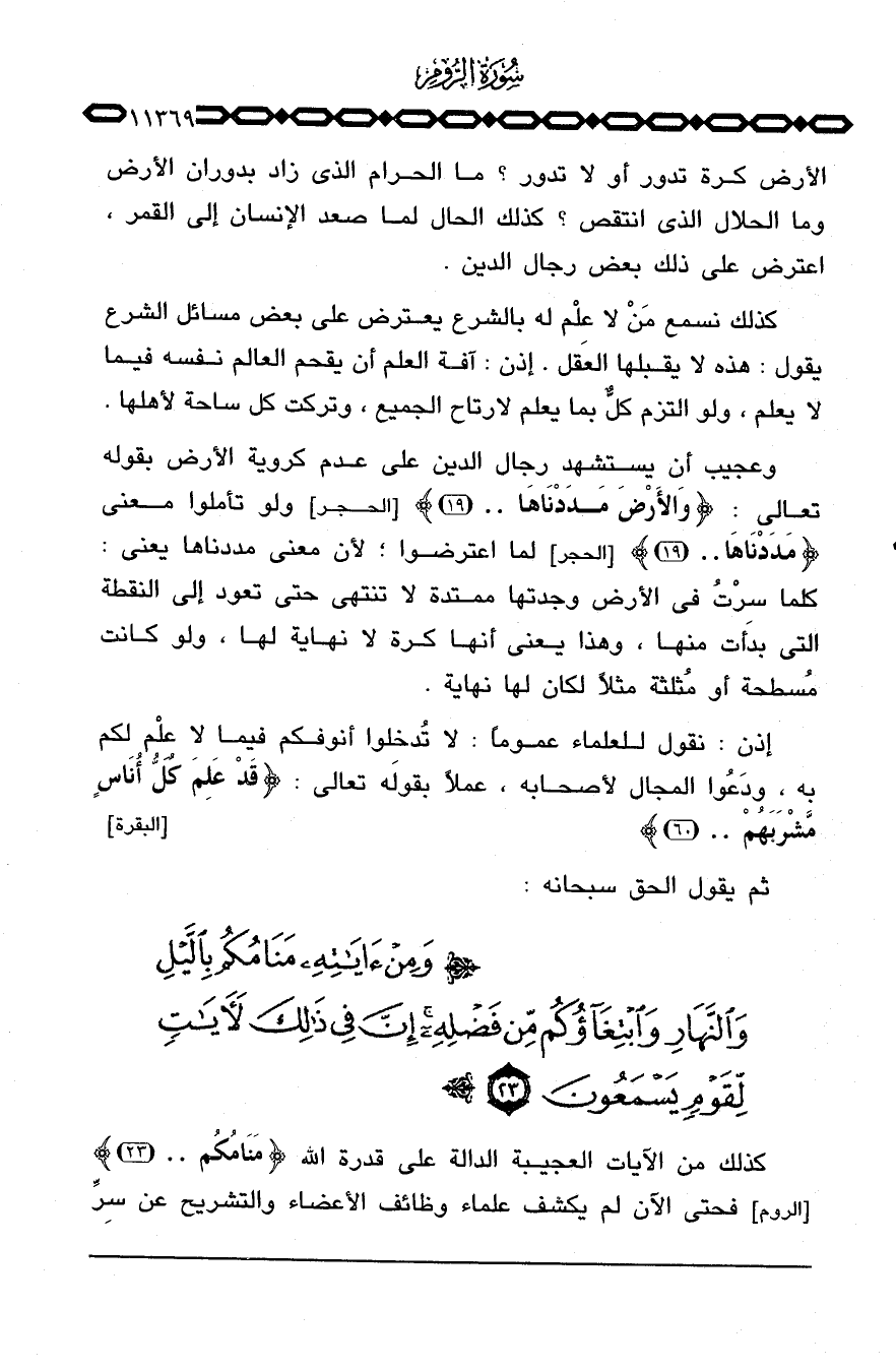 وعجيب أن يستشهد رجال الدين على عدم كروية الأرض بقوله تعالى: {والأرض مَدَدْنَاهَا ... } [الحجر: 19] ولو تأملوا معنى {مَدَدْنَاهَا ... } [الحجر: 19] لما اعترضوا؛ لأن معنى مددناها يعني: كلما سِرْتُ في الأرض وجدتها ممتدة لا تنتهي حتى تعود إلى النقطة التي بدأت منها، وهذا يعني أنها كرة لا نهاية لها، ولو كانت مُسطحة أو مُثلثة مثلاً لكان لها نهاية.