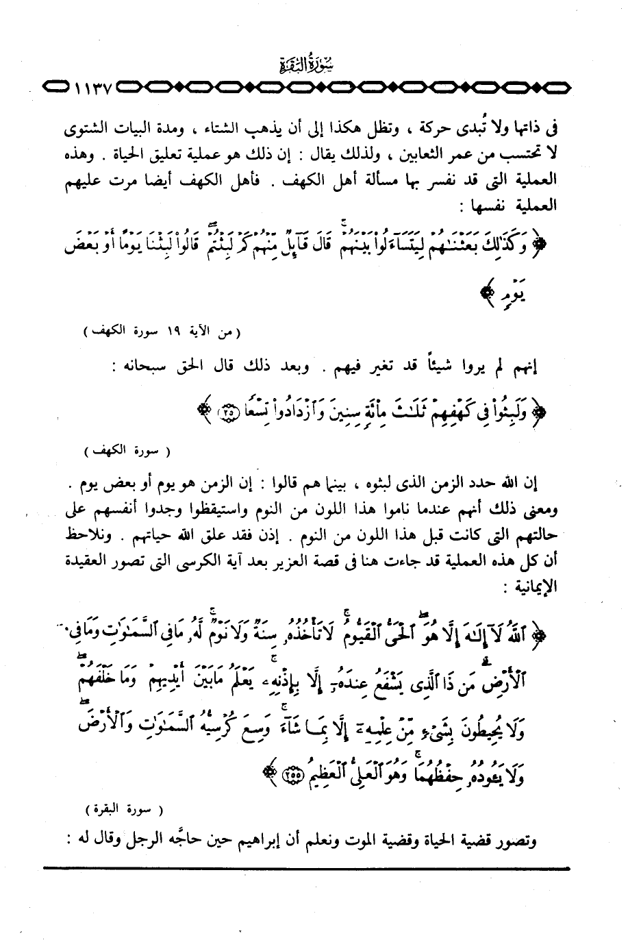 إن الله حدد الزمن الذي لبثوه، بينما هم قالوا: إن الزمن هو يوم أو بعض يوم. ومعنى ذلك أنهم عندما ناموا هذا اللون من النوم واستيقظوا وجدوا أنفسهم على حالتهم التي كانت قبل هذا اللون من النوم. إذن فقد علق الله حياتهم. ونلاحظ أن كل هذه العملية قد جاءت هنا في قصة العزير بعد آية الكرسي التي تصور العقيدة الإيمانية: {الله لاَ إله إِلاَّ هُوَ الحي القيوم لاَ تَأْخُذُهُ سِنَةٌ وَلاَ نَوْمٌ لَّهُ مَا فِي السماوات وَمَا فِي الأرض مَن ذَا الذي يَشْفَعُ عِنْدَهُ إِلاَّ بِإِذْنِهِ يَعْلَمُ مَا بَيْنَ أَيْدِيهِمْ وَمَا خَلْفَهُمْ وَلاَ يُحِيطُونَ بِشَيْءٍ مِّنْ عِلْمِهِ إِلاَّ بِمَا شَآءَ وَسِعَ كُرْسِيُّهُ السماوات والأرض وَلاَ يَؤُودُهُ حِفْظُهُمَا وَهُوَ العلي العظيم}