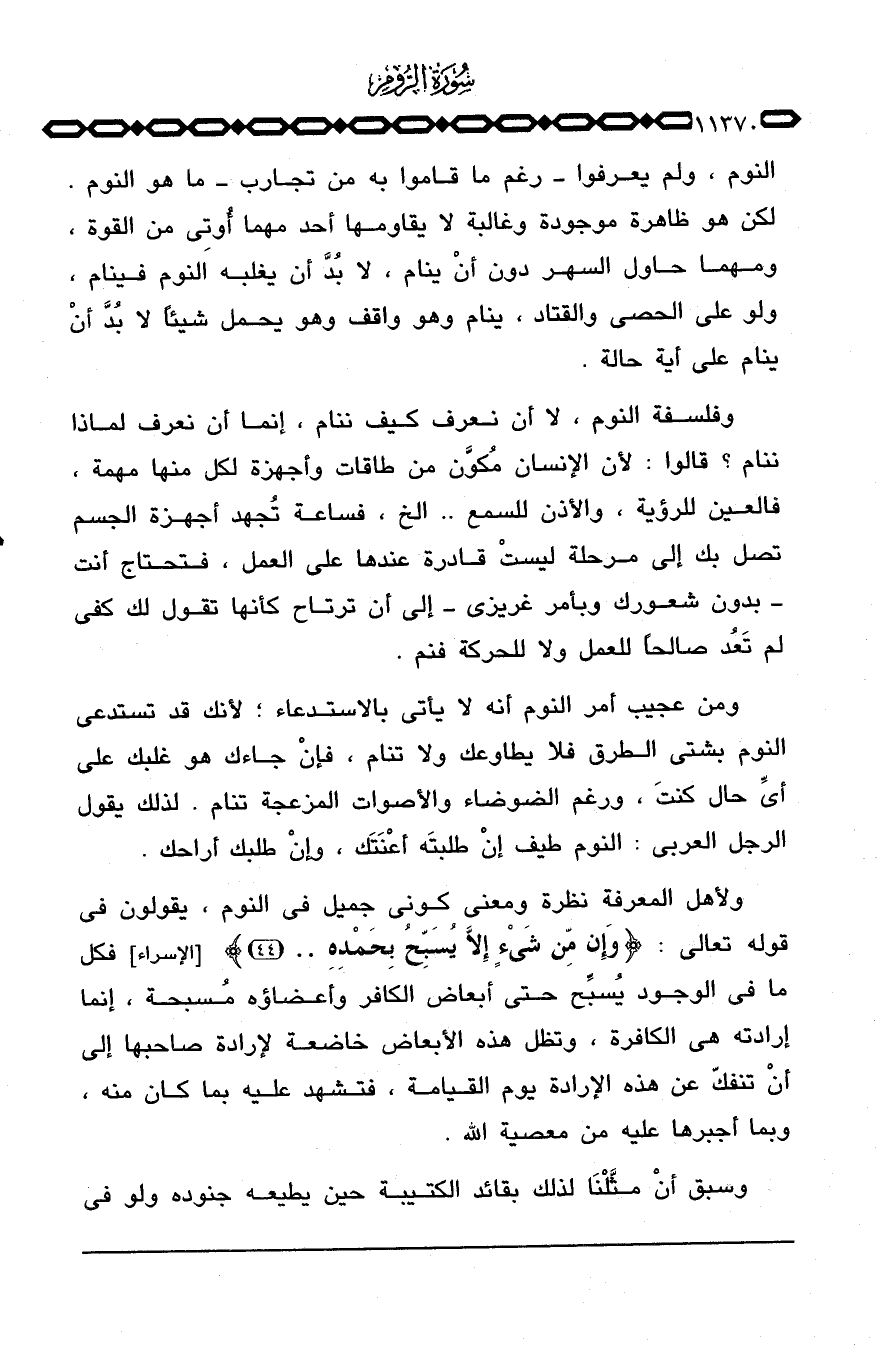 النوم، ولم يعرفوا - رغم ما قاموا به من تجارب - ما هو النوم. لكن هو ظاهرة موجودة وغالبة لا يقاومها أحد مهما أُوتِي من القوة، ومهما حاول السهر دون أنْ ينام، لا بُدَّ أن يغلبه النوم فينام، ولو على الحصى والقتاد، ينام وهو واقف وهو يحمل شيئاً لا بُدَّ أنْ ينام على أية حالة.