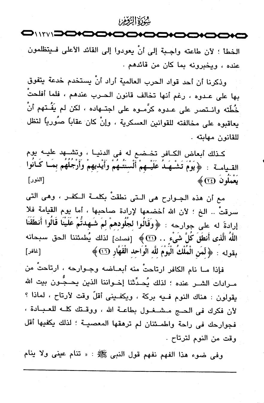 فإذا ما نام الكافر ارتاحتْ منه أبعاضه وجوارحه، ارتاحتْ من مرادات الشر عنده؛ لذلك يُحدِّثنا إخواننا الذين يحجُّون بيت الله يقولون: هناك النوم فيه بركة، ويكفيني أقلّ وقت لارتاح، لماذا؟ لأن فكرك في الحج مشغول بطاعة الله، ووقتك كله للعبادة، فجوارحك في راحة واطمئنان لم ترهقها المعصية؛ لذلك يكفيها أقل وقت من النوم لترتاح.