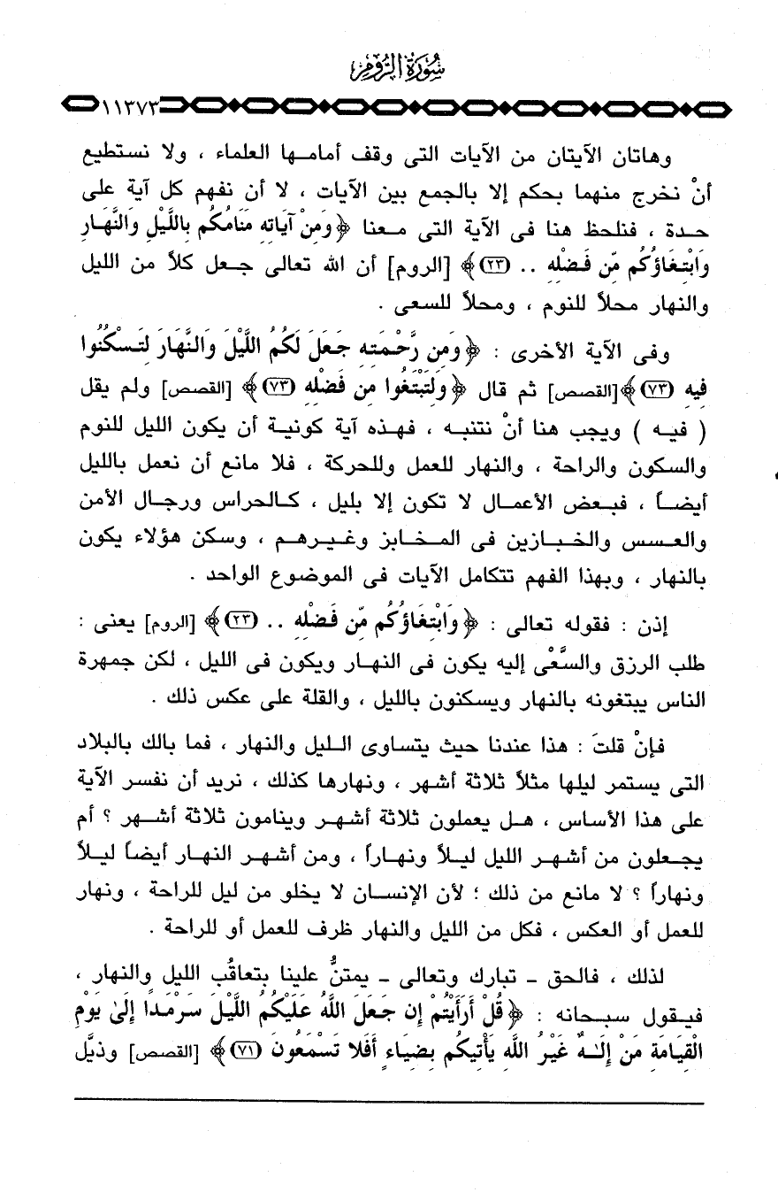 فإنْ قلتَ: هذا عندنا حيث يتساوى الليل والنهار، فما بالك بالبلاد التي يستمر ليلها مثلاً ثلاثة أشهر، ونهارها كذلك، نريد أن نفسر الآية على هذا الأساس، هل يعملون ثلاثة أشهر وينامون ثلاثة أشهر؟ أم يجعلون من أشهر الليل ونهاراً، ومن أشهر النهار أيضاً ليلاً ونهاراً؟ لا مانع من ذلك؛ لأن الإنسان لا يخلو من ليل للراحة، ونهار للعمل أو العكس، فكل من الليل والنهار ظرف للعمل أو للراحة.