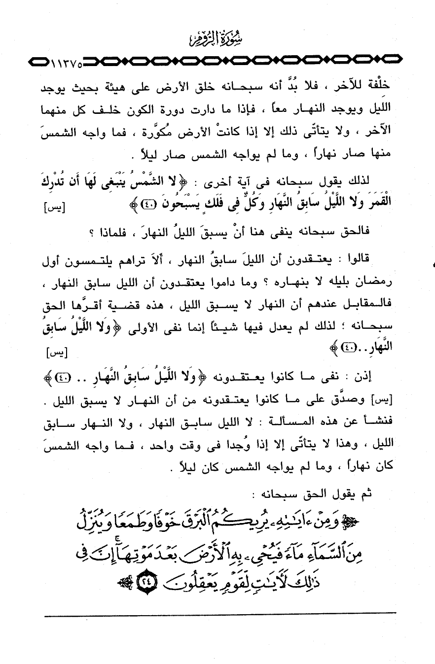 خِلْفة للآخر، فلا بُدَّ أنه سبحانه خلق الأرض على هيئة بحيث يوجد الليل ويوجد النهار معاً، فإذا ما دارت دورة الكون خلف كل منهما الآخر، ولا يتأتّى ذلك إلا إذا كانت الأرض مُكوَّرة، فما واجه الشمس منها صار نهاراً، وما لم يواجه الشمس صار ليلاً.