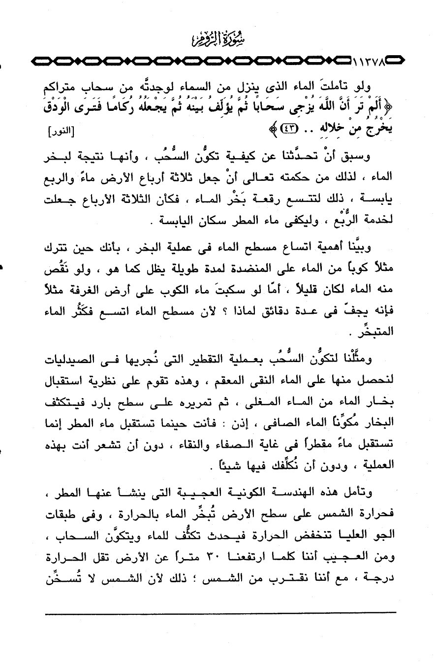 وتأمل هذه الهندسة الكونية العجيبة التي ينشأ عنها المطر، فحرارة الشمس على سطح الأرض تُبخِّر الماء بالحرارة، وفي طبقات الجو العليا تنخفض الحرارة فيحدث تكثُّف للماء ويتكوَّن السحاب، ومن العجيب أننا كلما ارتفعنا 30 متراً عن الأرض تقل الحرارة درجة، مع أننا نقترب من الشمس؛ ذلك لأن الشمس لا تُسخِّن