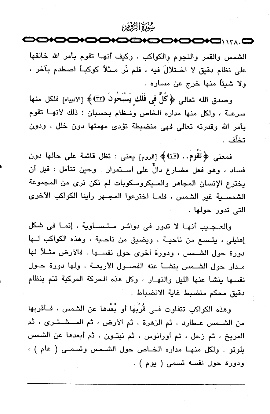 والعجيب أنها لا تدور في دوائر متساوية، إنما في شكل إهليلي، يتسع من ناحية، ويضيق من ناحية، وهذه الكواكب لها دورة حول الشمس، ودورة أخرى حول نفسها. فالأرض مثلاً لها مدار حول الشمس ينشأ عنه الفصول الأربعة، ولها دورة حول نفسها ينشأ عنها الليل والنهار، وكل هذه الحركة المركبة تتم بنظام دقيق محكم منضبط غاية الانضباط.