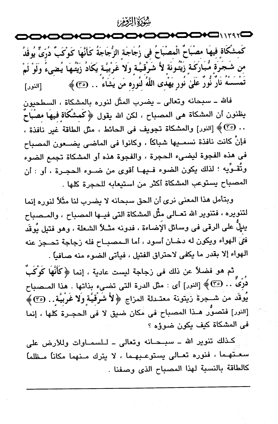 كَمِشْكَاةٍ فِيهَا مِصْبَاحٌ المصباح فِي زُجَاجَةٍ الزجاجة كَأَنَّهَا كَوْكَبٌ دُرِّيٌّ يُوقَدُ مِن شَجَرَةٍ مُّبَارَكَةٍ زَيْتُونَةٍ لاَّ شَرْقِيَّةٍ وَلاَ غَرْبِيَّةٍ يَكَادُ زَيْتُهَا يضياء وَلَوْ لَمْ تَمْسَسْهُ نَارٌ نُّورٌ على نُورٍ يَهْدِي الله لِنُورِهِ مَن يَشَآءُ ... } [النور: 35] .