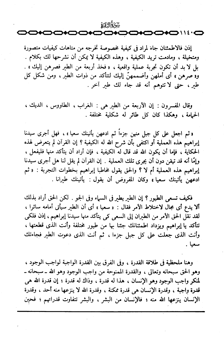 {ثُمَّ اجعل على كُلِّ جَبَلٍ مِّنْهُنَّ جُزْءًا ثُمَّ ادعهن يَأْتِينَكَ سَعْياً} ، فهل أجرى سيدنا إبراهيم هذه العملية أو اكتفى بأن شرح الله له الكيفية؟ إن القرآن لم يتعرض لهذه الحكاية، فإما أن يكون الله قد قال له الكيفية، فإن أراد أن يتأكد منها فليفعل، وإما أنه قد تيقن دون أن يجري تلك العملية. إن القرآن لم يقل لنا هل أجرى سيدنا إبراهيم هذه العملية أم لا؟ والحق يقول مخاطبا إبراهيم بخطوات التجربة: {ثُمَّ ادعهن يَأْتِينَكَ سَعْياً} وكان المفروض أن يقول: يأتينك طيرانا. فكيف تسعى الطيور؟ إن الطير يطير في السماء وفي الجو. لكن الحق أراد بذلك ألا يدع أي مجال لاختلاط الأمر فقال: «سعيا» أي أن الطير سيأتي أمامه سائرا، لقد نقل الحق الأمر من الطيران إلى السعي كي يتأكد منها سيدنا إبراهيم، إذن فلكي تتأكد يا إبراهيم ويزداد اطمئنانك جئنا بها من طيور مختلفة وأنت الذي قطعتها، وأنت الذي جعلت على كل جبل جزءا، ثم أنت الذي دعوت الطير فجاءتك سعيا.