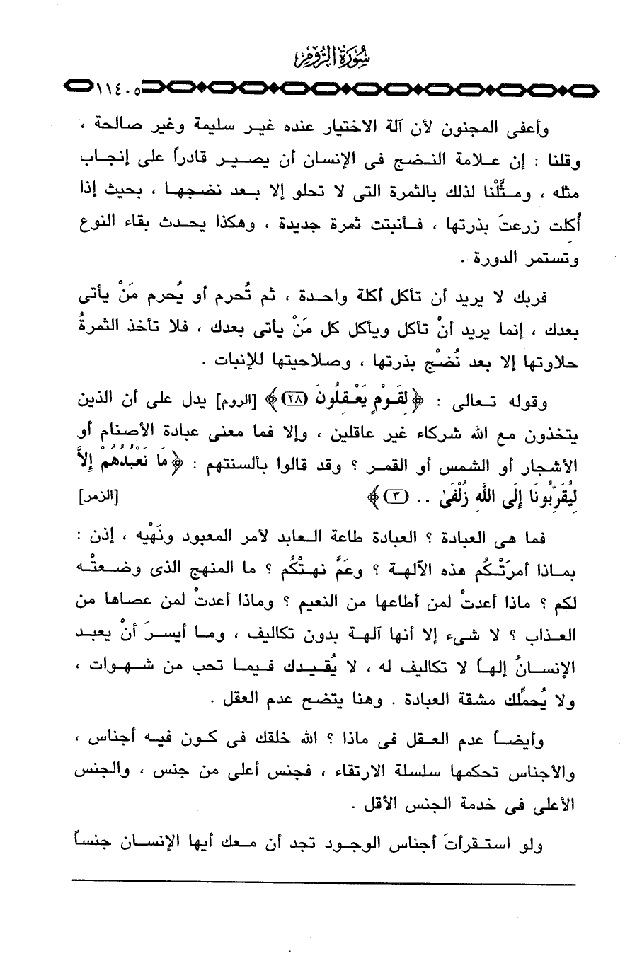 وقوله تعالى: {لِقَوْمٍ يَعْقِلُونَ} [الروم: 28] يدل على أن الذين يتخذون مع الله شركاء غير عاقلين، وإلا فما معنى عبادة الأصنام أو الأشجار أو الشمس أو القمر؟ وقد قالوا بألسنتهم: {مَا نَعْبُدُهُمْ إِلاَّ لِيُقَرِّبُونَآ إِلَى الله زلفى ... } [الزمر: 3] .