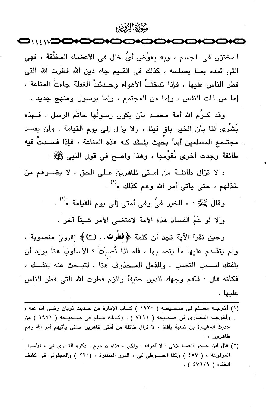 وقد كرَّم الله أمة محمد بأن يكون رسولُها خاتَم الرسل، فهذه بُشْرى لنا بأن الخير باقٍ فينا، ولا يزال في يوم القيامة، ولن يفسد مجتمع المسلمين أبداً بحيث يفقد كله هذه المناعة، فإذا فسدتْ فيه طائفة وجدت أخرى تُقوِّمها، وهذا واضح في قول النبي صَلَّى اللَّهُ عَلَيْهِ وَسَلَّم َ.