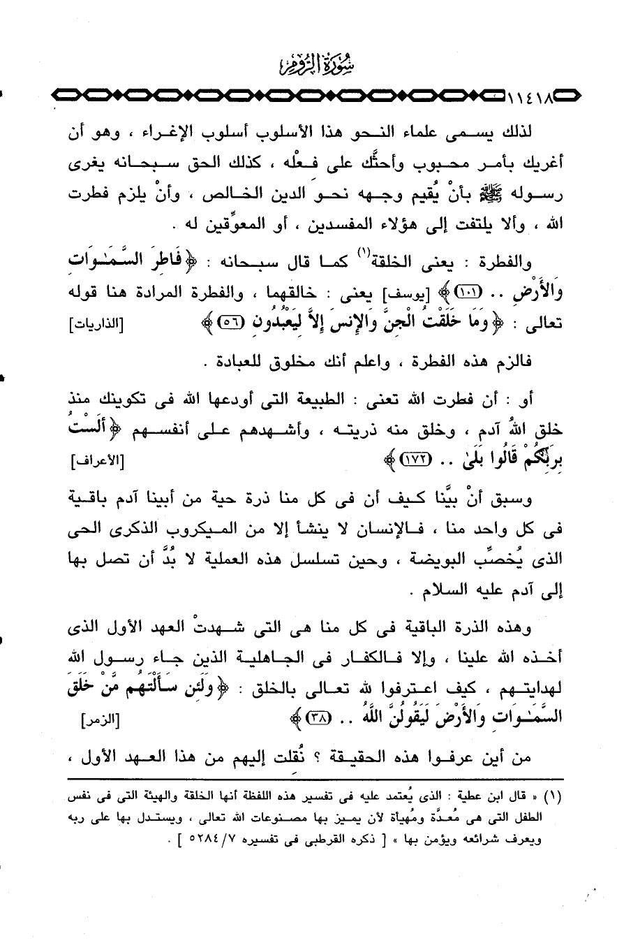 والفطرة: يعني الخلقة كما قال سبحانه: {فَاطِرَ السماوات والأرض ... } [يوسف: 101] يعني: خالقهما، والفطرة المرادة هنا قوله تعالى: {وَمَا خَلَقْتُ الجن والإنس إِلاَّ لِيَعْبُدُونِ} [الذاريات: 56] .