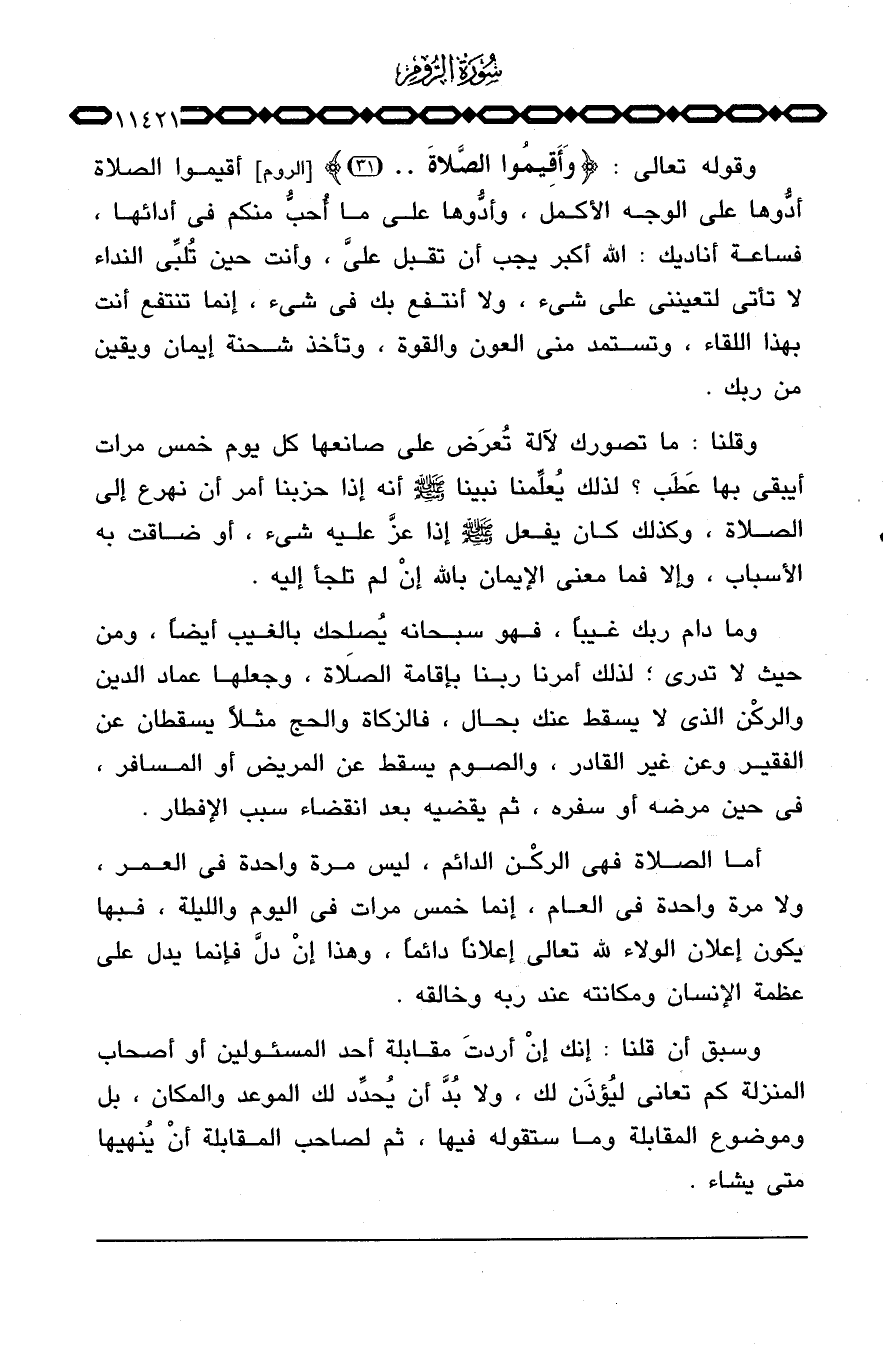 وقوله تعالى: {وَأَقِيمُواْ الصلاة ... } [الروم: 31] أقيموا الصلاة أدُّوها على الوجه الأكمل، وأدُّوها على ما أُحبُّ منكم في أدائها، فساعة أناديك: الله أكبر يجب أن تقبل عليَّ، وأنت حين تُلبِّي النداء لا تأتي لتعينني على شيء، ولا أنتفع بك في شيء، إنما تنتفع أنت بهذا اللقاء، وتستمد مني العون والقوة، وتأخذ شحنة إيمان ويقين من ربك.
