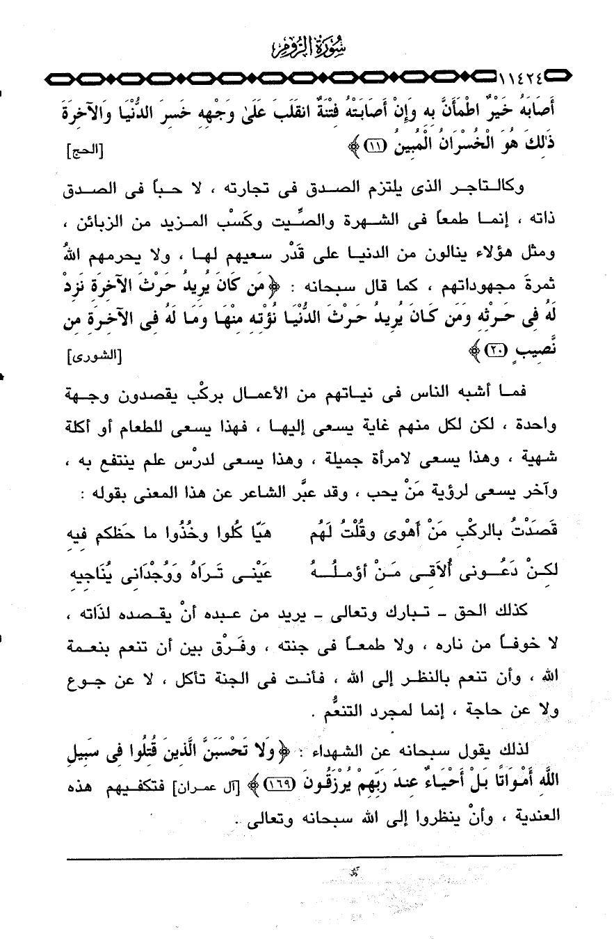 كذلك الحق - تبارك وتعالى - يريد من عبده أنْ يقصده لذَاته، لا خوفاً من ناره، ولا طمعاً في جنته، وفَرْق بين أن تنعم بنعمة الله، وأن تنعم بالنظر إلى الله، فأنت في الجنة تأكل، لا عن جوع ولا عن حاجة، إنما لمجرد التنعُّم.
