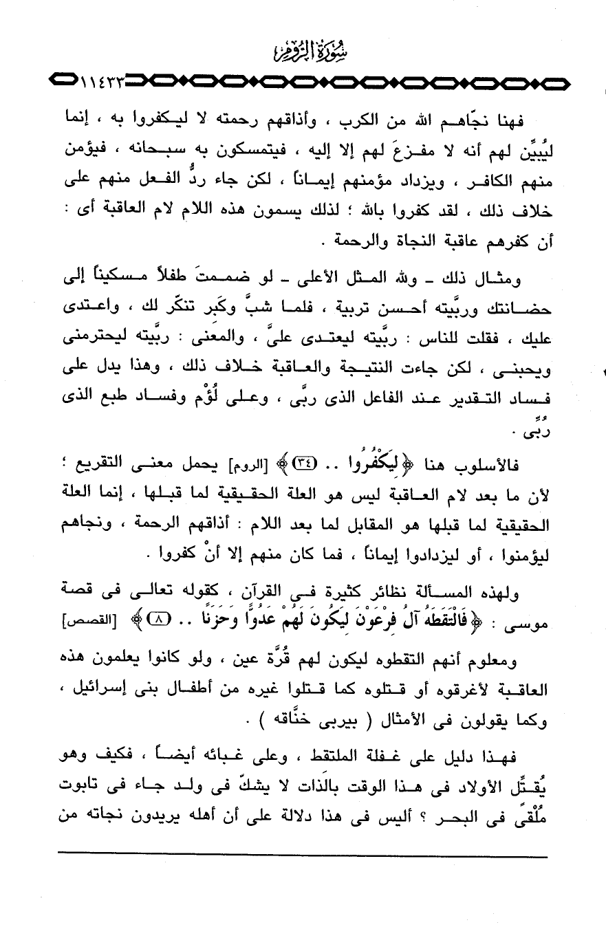 فهنا نجّاهم الله من الكرب، وأذاقهم رحمته لا ليكفروا به، إنما ليُبيِّن لهم أنه لا مفزعَ لهم إلا إليه، فيتمسكون به سبحانه، فيؤمن منهم الكافر، ويزداد مؤمنهم إيماناً، لكن جاء ردُّ الفعل منهم على خلاف ذلك، لقد كفروا بالله؛ لذلك يسمون هذه اللام لام العاقبة أي: أن كفرهم عاقبة النجاة والرحمة.