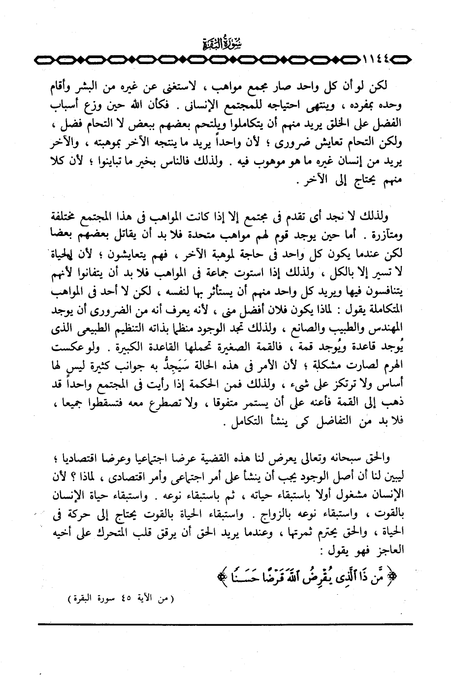 ولذلك لا نجد أي تقدم في مجتمع إلا إذا كانت المواهب في هذا المجتمع مختلفة ومتآزرة. أما حين يوجد قوم لهم مواهب متحدة فلابد أن يقاتل بعضهم بعضا لكن عندما يكون كل واحد في حاجة لموهبة الآخر، فهم يتعايشون؛ لأن الحياة لا تسير إلا بالكل، ولذلك إذا استوت جماعة في المواهب فلا بد أن يتفانوا لأنهم يتنافسون فيها ويريد كل واحد منهم أن يستأثر بها لنفسه، لكن لا أحد في المواهب المتكاملة يقول: لماذا يكون فلان أفضل مني، لأنه يعرف أنه من الضروري أن يوجد المهندس والطبيب والصانع، ولذلك تجد الوجود منظما بذاته التنظيم الطبيعي الذي يُوجد قاعدة ويُوجد قمة، فالقمة الصغيرة تحملها القاعدة الكبيرة. ولو عكست الهرم لصارت مشكلة؛ لأن الأمر في هذه الحالة سَيَجِّدُ به جوانب كثيرة ليس لها أساس ولا ترتكز على شيء، ولذلك فمن الحكمة إذا رأيت في المجتمع واحداً قد ذهب إلى القمة فأعنه على أن يستمر متفوقا، ولا تصطرع معه فتسقطوا جميعا، فلابد من التفاضل كي ينشأ التكامل.