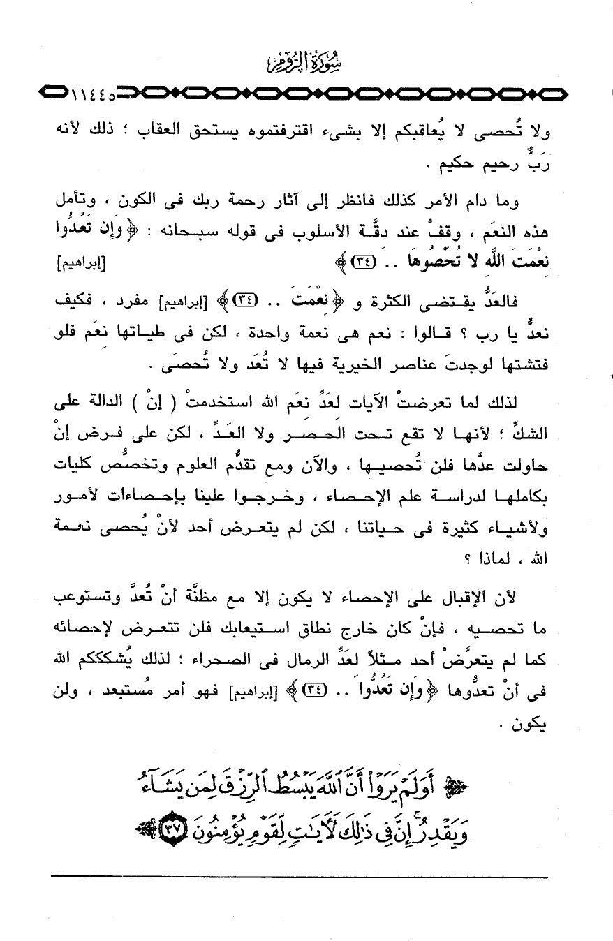 لذلك لما تعرضتْ الآيات لِعَدِّ نِعَم الله استخدمتْ (إنْ) الدالة على الشكِّ؛ لأنها لا تقع تحت الحصر ولا العَدِّ، لكن على فرض إنْ حاولت عدَّها فلن تُحصيها، والآن ومع تقدُّم العلوم وتخصُّص كليات بكاملها لدراسة علم الإحصاء، وخرجوا علينا بإحصاءات لأمور ولأشياء كثيرة في حياتنا، لكن لم يتعرض أحد لأنْ يُحصي نعمة الله، لماذا؟