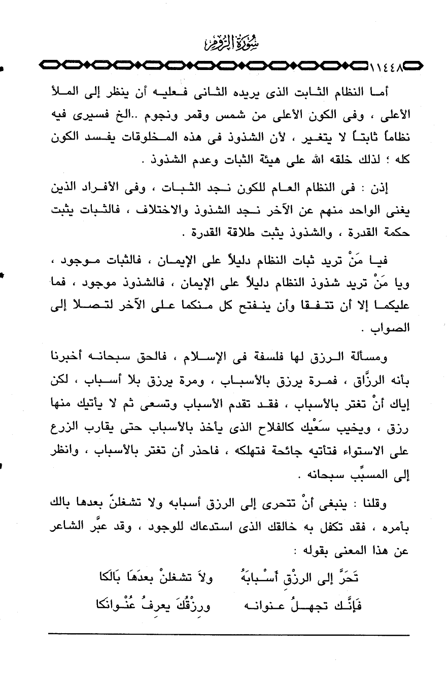 إذن: في النظام العام للكون نجد الثبات، وفي الأفراد الذين يغني الواحد منهم عن الآخر نجد الشذوذ والاختلاف، فالثبات يثبت حكمة القدرة، والشذوذ يثبت طلاقة القدرة.
