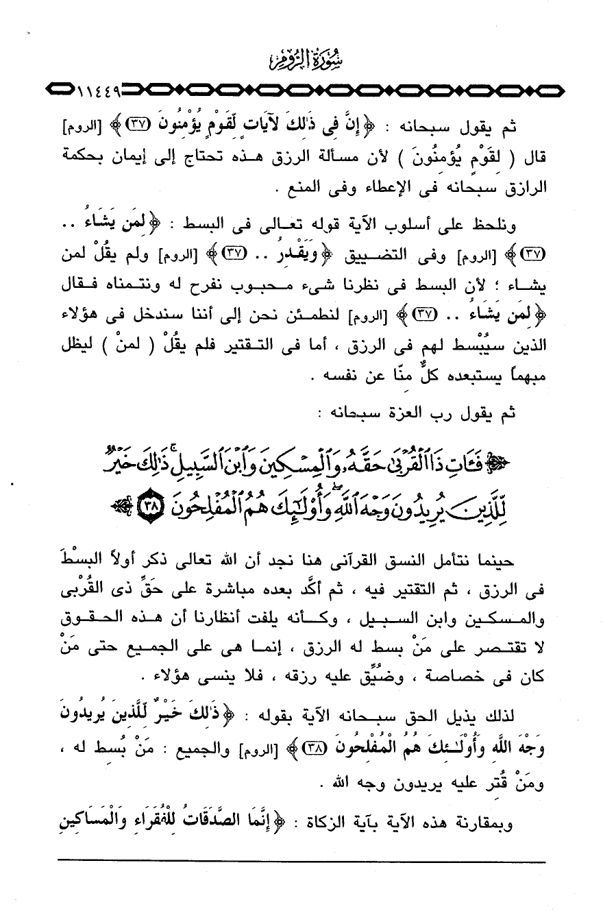 ثم يقول سبحانه: {إِنَّ فِي ذَلِكَ لآيَاتٍ لِّقَوْمٍ يُؤْمِنُونَ} [الروم: 37] قال (لِقَوْمٍ يُؤمِنُونَ) لأن مسألة الرزق هذه تحتاج إلى إيمان بحكمة الرازق سبحانه في الإعطاء وفي المنع.
