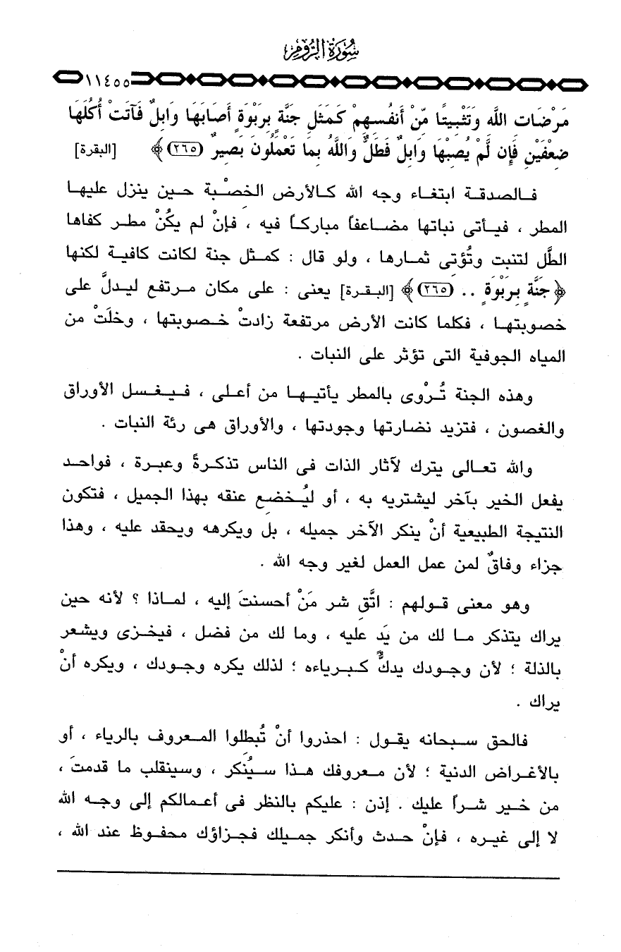 مَرْضَاتِ الله وَتَثْبِيتاً مِّنْ أَنْفُسِهِمْ كَمَثَلِ جَنَّةٍ بِرَبْوَةٍ أَصَابَهَا وَابِلٌ فَآتَتْ أُكُلَهَا ضِعْفَيْنِ فَإِن لَّمْ يُصِبْهَا وَابِلٌ فَطَلٌّ والله بِمَا تَعْمَلُونَ بَصِيرٌ} [البقرة: 265] .