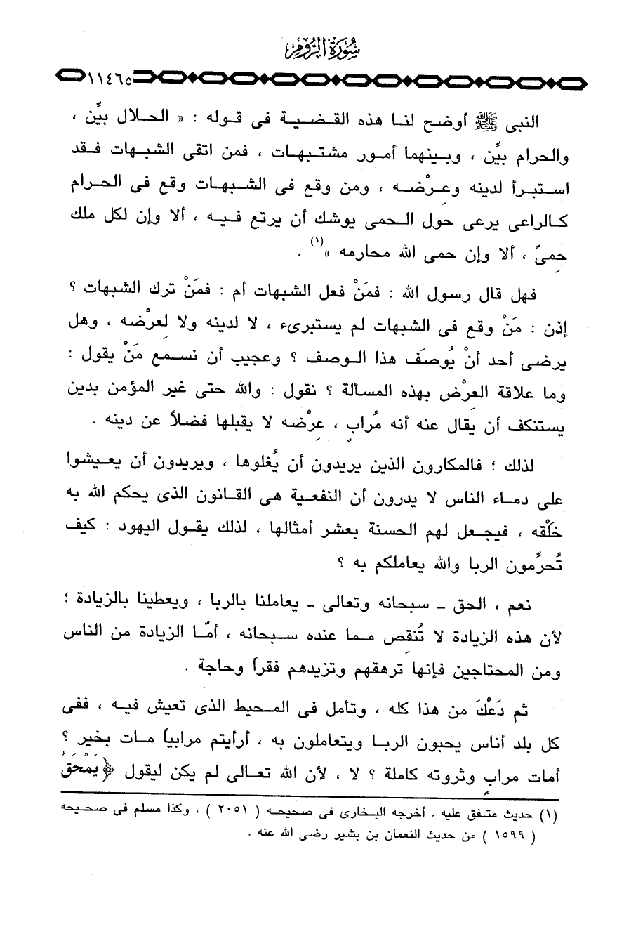 النبي صَلَّى اللَّهُ عَلَيْهِ وَسَلَّم َ أوضح لنا هذه القضية في قوله: «الحلال بيِّن، والحرام بيِّن، وبينهما أمور مشتبهات، فمن اتقى الشبهات فقد استبرأ لدينه وعِرْضه، ومن وقع في الشبهات وقع في الحرام كالراعي يرعى حول الحمى يوشك أن يرتع فيه، ’ألا وإن لكل ملك حِمىً، ألا وإن حمى الله محارمه» .