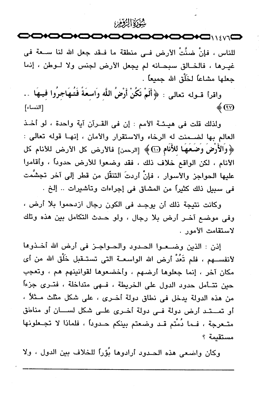 إذن: الذين وضعوا الحدود والحواجز في أرض الله أخذوها لأنفسهم، فلم تَعُدْ أرض الله الواسعة التي تستقبل خَلْق الله من أي مكان آخر، إنما جعلوها أرضهم، وأخضعوها لقوانينهم هم، وتعجب حين تتأمل حدود الدول على الخريطة، فهي متداخلة، فترى جزءاً من هذه الدولة يدخل في نطاق دولة أخرى، على شكل مثلث مثلاً، أو تمتد أرض دولة في دولة أخرى على شكل لسان أو مناطق متعرجة، فماذ دُمْتم قد وضعتم بينكم حدوداً، فلماذا لا تجعلونها مستقيمة؟