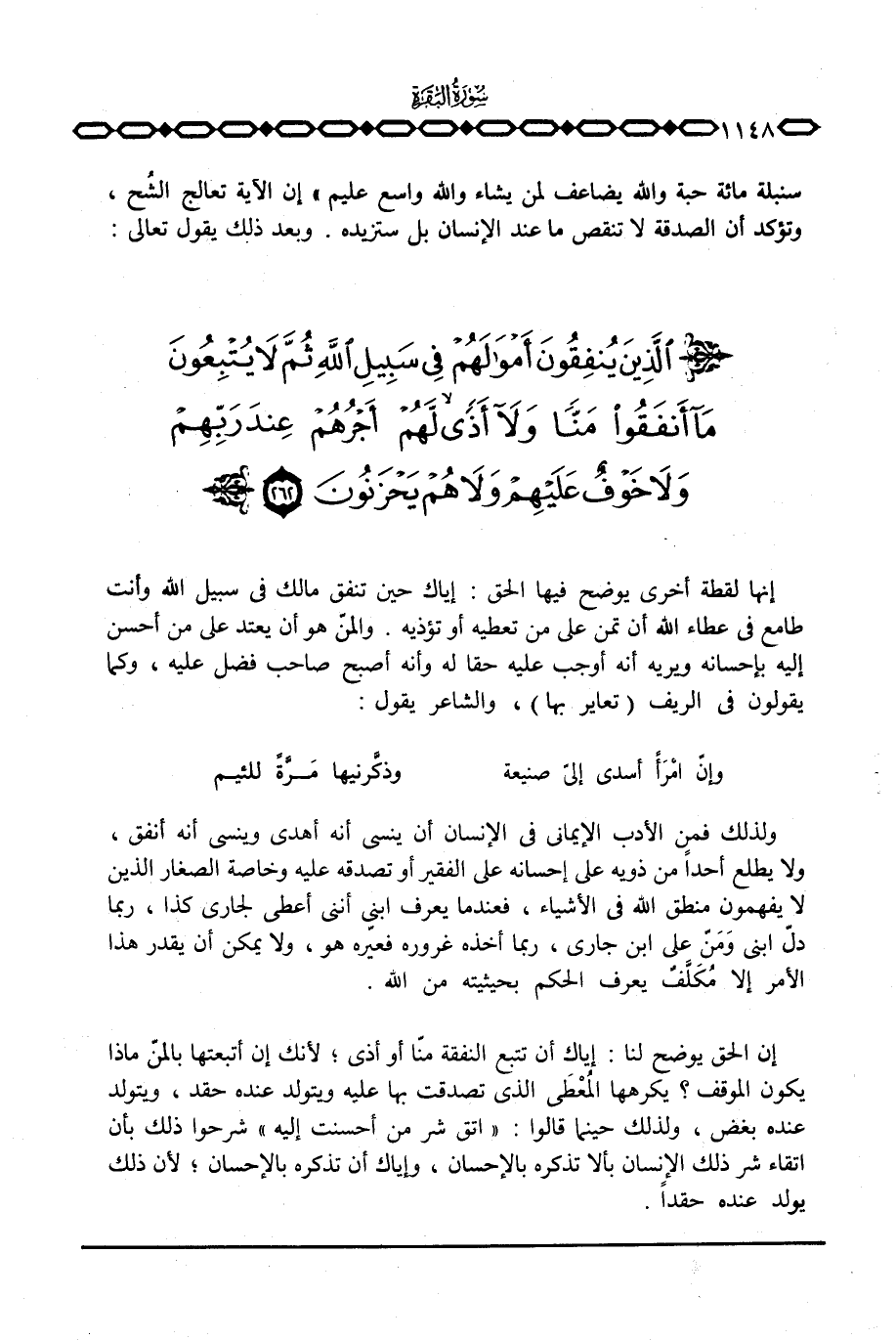 سُنبُلَةٍ مِّئَةُ حَبَّةٍ والله يُضَاعِفُ لِمَن يَشَآءُ والله وَاسِعٌ عَلِيمٌ} إن الآية تعالج الشح، وتؤكد أن الصدقة لا تنقص ما عند الإنسان بل ستزيده. وبعد ذلك يقول تعالى: {الذين يُنْفِقُونَ أَمْوَالَهُمْ فِي سَبِيلِ الله ثُمَّ لاَ يُتْبِعُونَ مَآ أَنْفَقُواُ مَنّاً وَلاَ أَذًى ... }