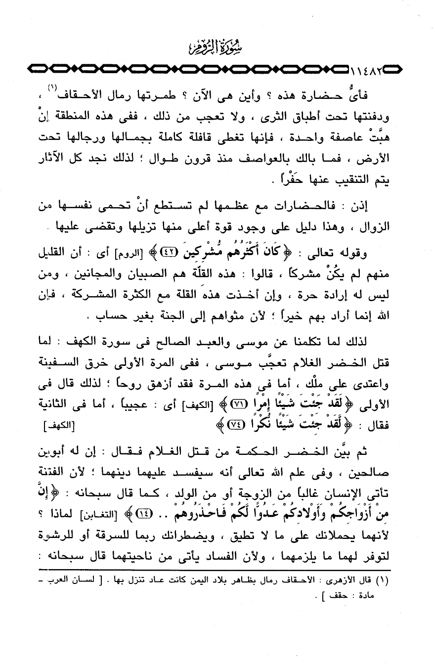 فأيُّ حضارة هذه؟ وأين هي الآن؟ طمرتها رمال الأحقاف، ودفنتها تحت أطباق الثرى، ولا تعجب من ذلك، ففي هذه المنطقة إنْ هبَّتْ عاصفة واحدة، فإنها تغطي قافلة كاملة بجمالها ورجالها تحت الأرض، فما بالك بالعواصف منذ قرون طوال؛ لذلك نجد كل الآثار يتم التنقيب عنها حَفْراً.