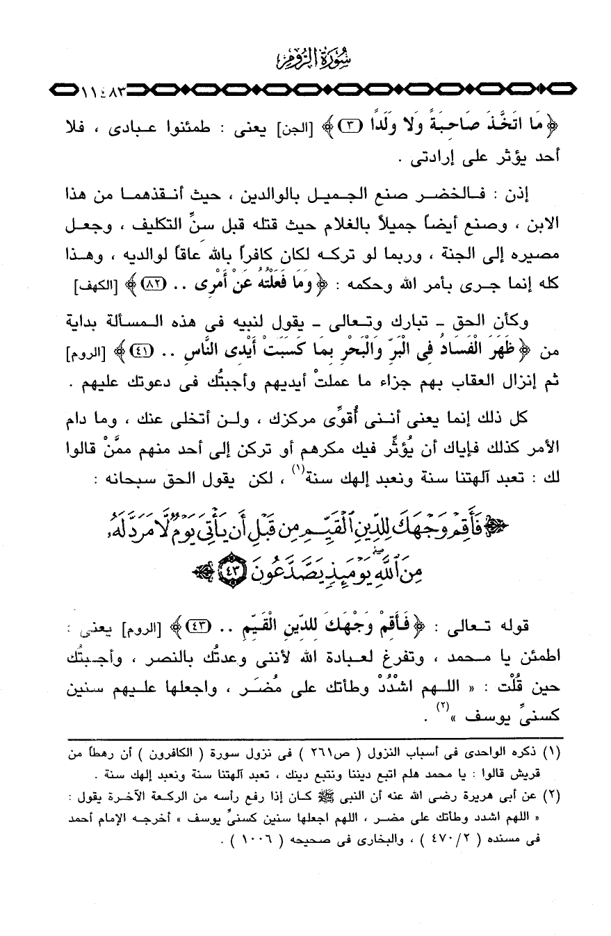 إذن: فالخضر صنع الجميل بالوالدين، حيث أنقذهما من هذا الابن، وصنع أيضاً جميلاً بالغلام حيث قتله قبل سِنِّ التكليف، وجعل مصيره إلى الجنة، وربما لو تركه لكان كافراً بالله عاقاً لوالديه، وهذا كله إنما جرى بأمر الله وحكمه: {وَمَا فَعَلْتُهُ عَنْ أَمْرِي ... } [الكهف: 82] .