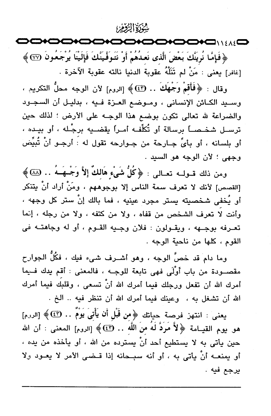 ومن ذلك قوله تعالى: {كُلُّ شَيْءٍ هَالِكٌ إِلاَّ وَجْهَهُ ... } [القصص: 88] لأنك لا تعرف سمة الناس إلا بوجوههم، ومَنْ أراد أنْ يتنكر أو يُخفي شخصيته يستر مجرد عينيه، فما بالك إنْ ستر كل وجهه، وأنت لا تعرف الشخص من قفاه، ولا من كتفه، ولا من رجله، إنما تعرفه بوجهه، ويقولون: فلان وجيه القوم، أو له وجاهته في القوم، كلها من ناحية الوجه.