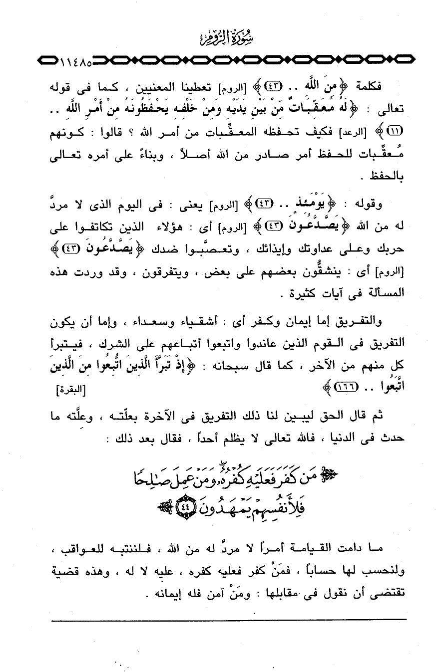 ما دامت القيامة أمراً لا مردَّ له من الله، فلننتبه للعواقب، ولنحسب لها حساباً، فمَنْ كفر فعليه كفره، عليه لا له، وهذه قضية تقتضي أن نقول في مقابلها: ومَنْ آمن فله إيمانه.