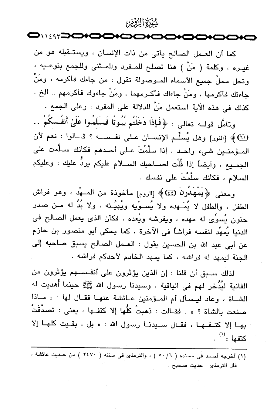 ومعنى {يَمْهَدُونَ} [الروم: 44] مأخوذة من المهْد، وهو فراش الطفل، والطفل لا يُمَهده ولا يُسوّيه ويُهيِّئه، ولا بُدَّ له من صدر حنون يُسوِّي له مهده، ويفرشه ويُعده، فكأن الذي يعمل الصالح في الدنيا يُمهِّد لنفسه فراشاً في الآخرة، كما يحكي أبو منصور بن حازم عن أبي عبد الله بن الحسين يقول: العمل الصالح يسبق صاحبه إلى الجنة ليمهد له فراشه، كما يمهد الخادم لأحدكم فراشه.