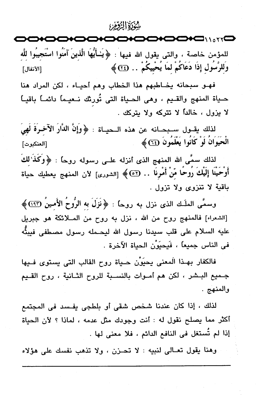 وسمَّى الملَك الذي نزل به روحاً: {نَزَلَ بِهِ الروح الأمين} [الشعراء: 193] فالمنهج روح من الله، نزل به روح من الملائكة هو جبريل عليه السلام على قلب سيدنا رسول الله ليحمله رسول مصطفى فيبثُّه في الناس جميعاً، فَيحيَوْن الحياة الآخرة.