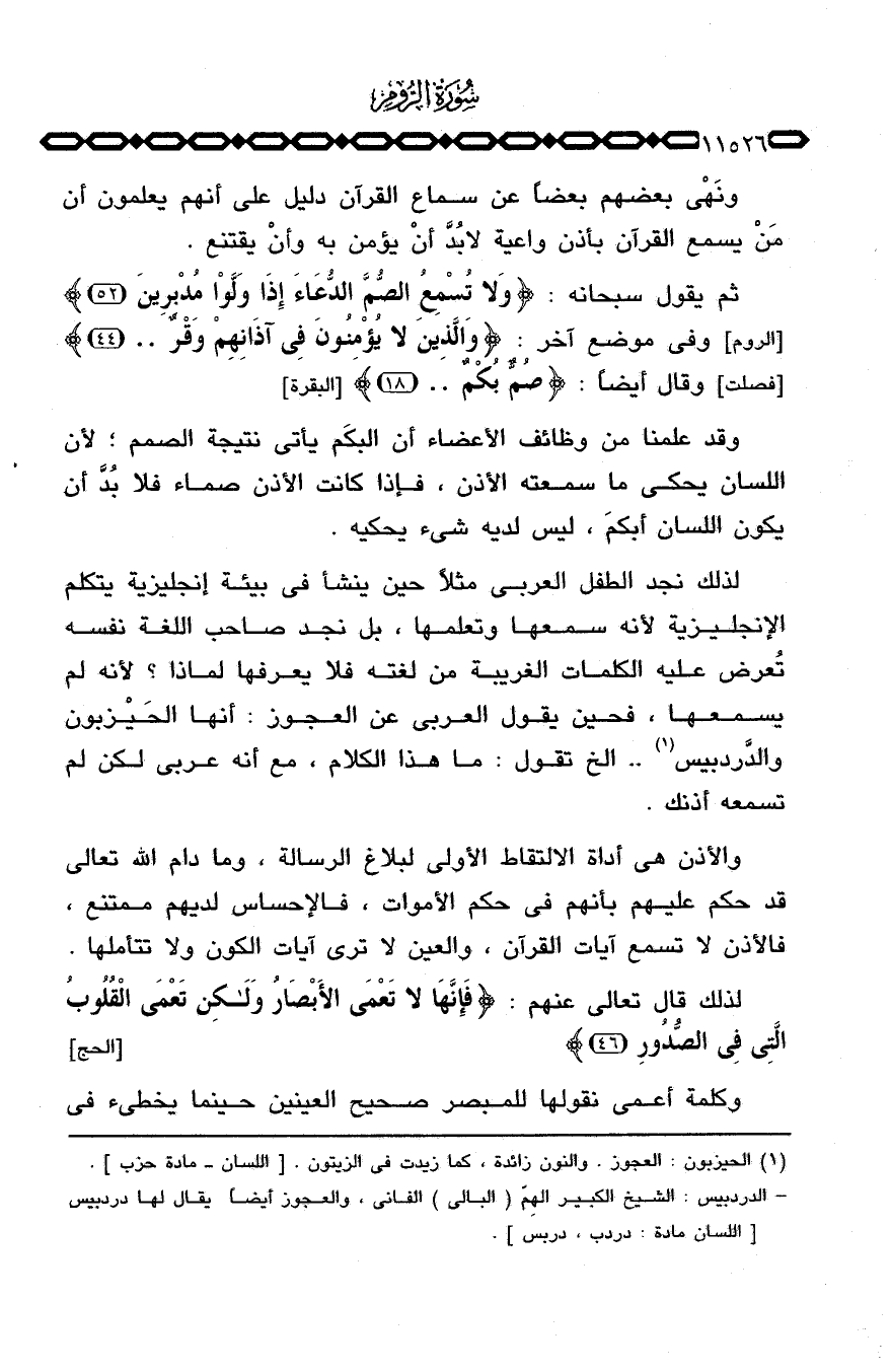 والأذن هي أداة الالتقاط الأولى لبلاغ الرسالة، وما دام الله تعالى قد حكم عليهم بأنهم في حكم الأموات، فالإحساس لديهم ممتنع، فالأذن لا تسمع آيات القرآن، والعين لا ترى آيات الكون ولا تتأملها.