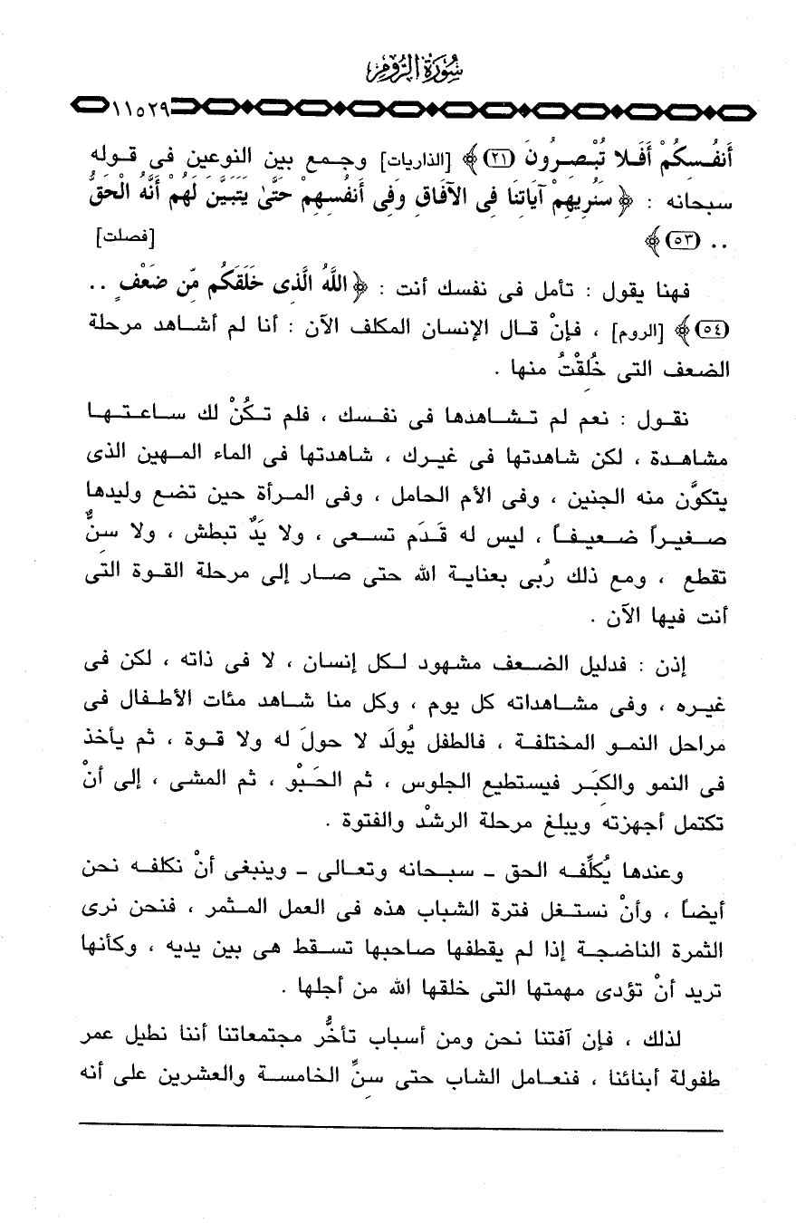 إذن: فدليل الضعف مشهود لكل إنسان، لا في ذاته، لكن في غيره، وفي مشاهداته كل يوم، وكل منا شاهد مئات الأطفال في مراحل النمو المختلفة، فالطفل يُولَد لا حولَ له ولا قوة، ثم يأخذ في النمو والكَِبَر فيستطيع الجلوس، ثم الحَبْو، ثم المشي، إلى أنْ تكتمل أجهزته ويبلغ مرحلة الرشْد والفتوة.