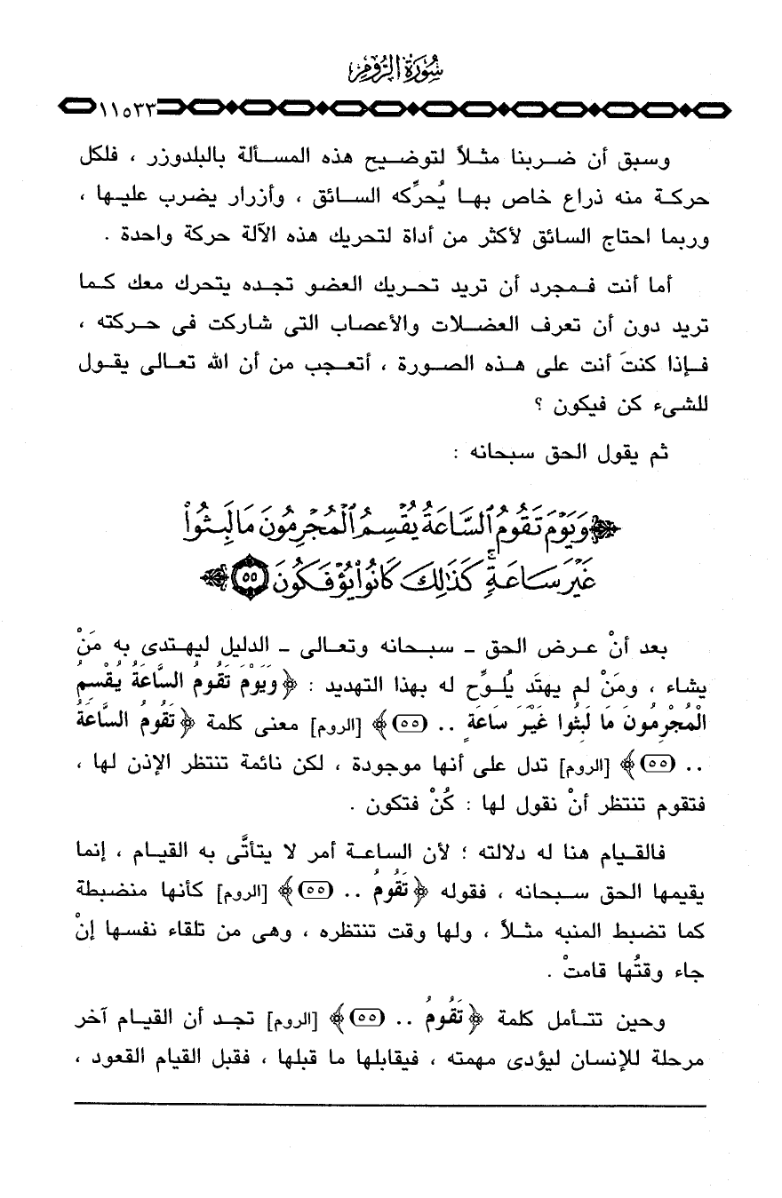 وحين تتأمل كلمة {تَقُومُ ... } [الروم: 55] تجد أن القيام آخر مرحلة للإنسان ليؤدي مهمته، فيقابلها ما قبلها، فقبل القيام القعود،