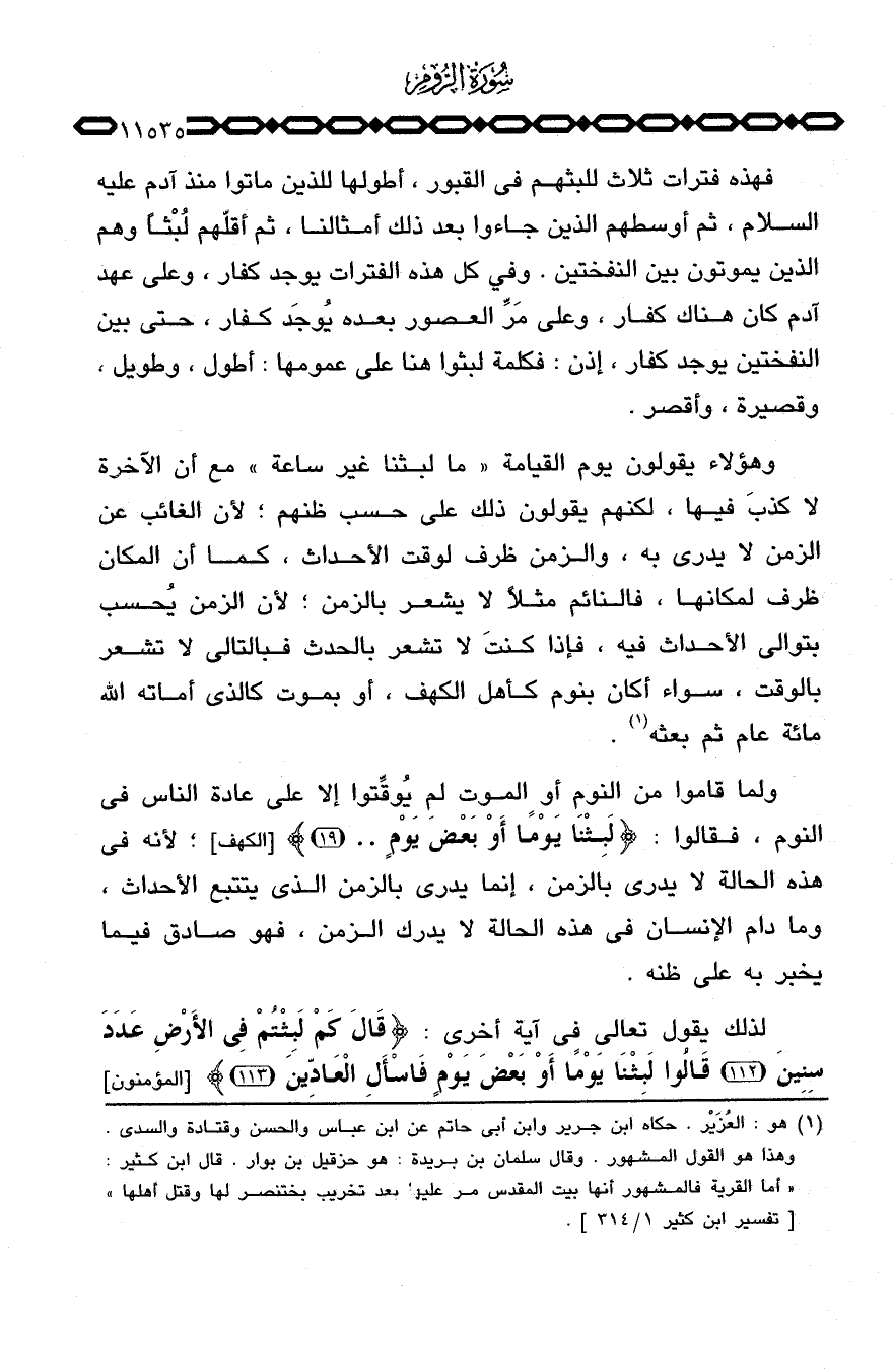 وهؤلاء يقولون يوم القيامة «ما لبثنا غير ساعة» مع أن الآخرة لا كذب فيها، لكنهم يقولون ذلك على حسب ظنهم؛ لأن الغائب عن الزمن لا يدري به، والزمن ظرف لوقت الأحداث، كما أن المكان ظرف لمكانها، فالنائم مثلاً لا يشعر بالزمن؛ لأن الزمن يُحسب بتوالي الأحداث فيه، فإذا كنتَ لا تشعر بالحدث فبالتالي لا تشعر بالوقت، سواء أكان بنوم كأهل الكهف، أو بموت كالذي أماته الله مائة عام ثم بعثه.
