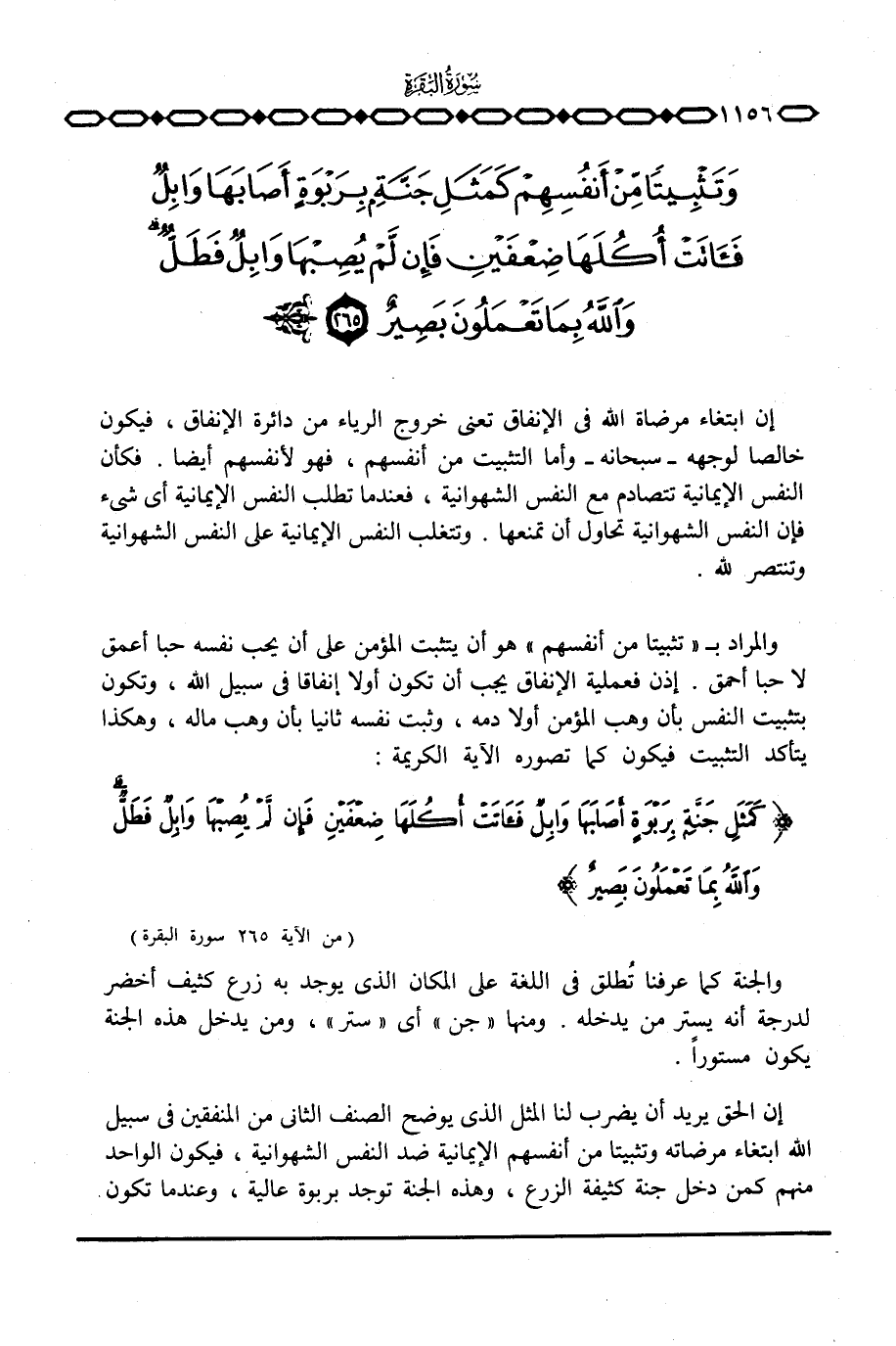 إن الحق يريد أن يضرب لنا المثل الذي يوضح الصنف الثاني من المنفقين في سبيل الله ابتغاء مرضاته وتثبيتا من أنفسهم الإيمانية ضد النفس الشهوانية، فيكون الواحد منهم كمن دخل جنة كثيفة الزرع، وهذه الجنة توجد بربوة عالية، وعندما تكون