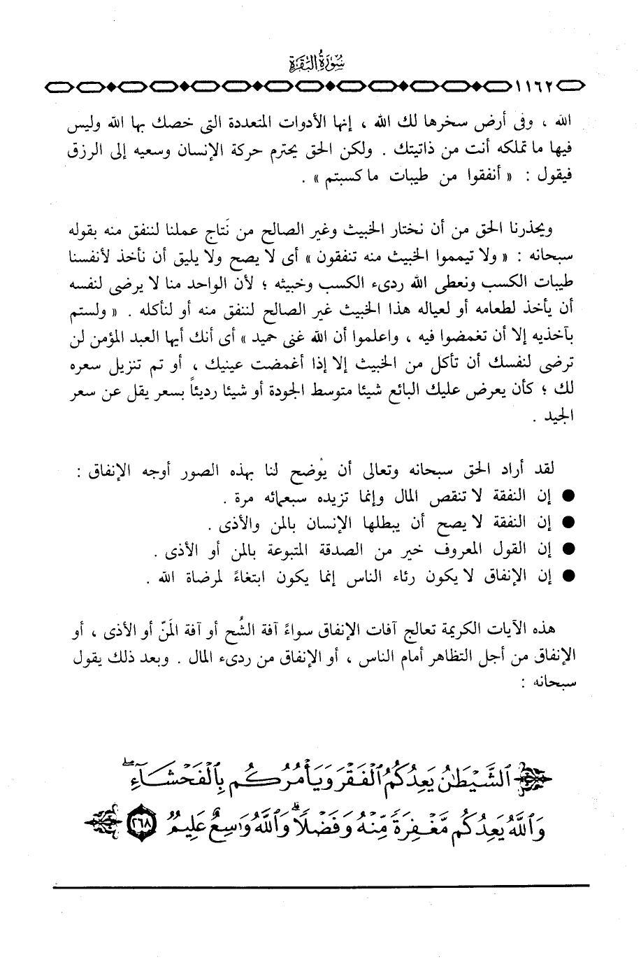 هذه الآيات الكريمة تعالج آفات الإنفاق سواءً آفة الشح أو آفة المن أو الأذى، أو الإنفاق من أجل التظاهر أمام الناس، أو الإنفاق من رديء المال. وبعد ذلك يقول سبحانه: {الشيطان يَعِدُكُمُ الفقر وَيَأْمُرُكُم بالفحشآء ... }