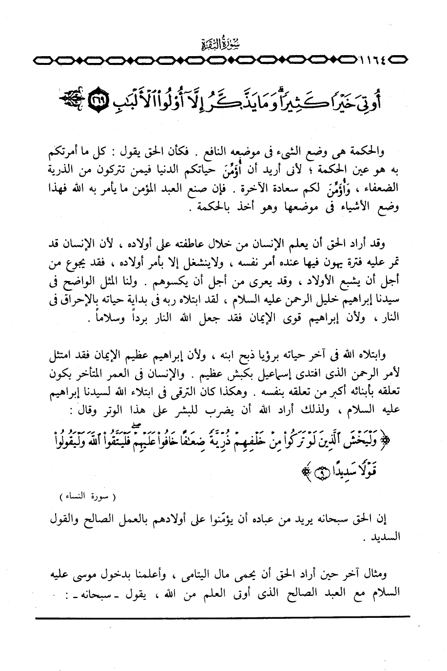 والحكمة هي وضع الشيء في موضعه النافع. فكأن الحق يقول: كل ما أمرتكم به هو عين الحكمة؛ لأني أريد أن أُؤَمِّنَ حياتكم الدنيا فيمن تتركون من الذرية الضعفاء، وأُؤَمِّنَ لكم سعادة الآخرة. فإن صنع العبد المؤمن ما يأمر به الله فهذا وضع الأشياء في موضعها وهو أخذ بالحكمة.