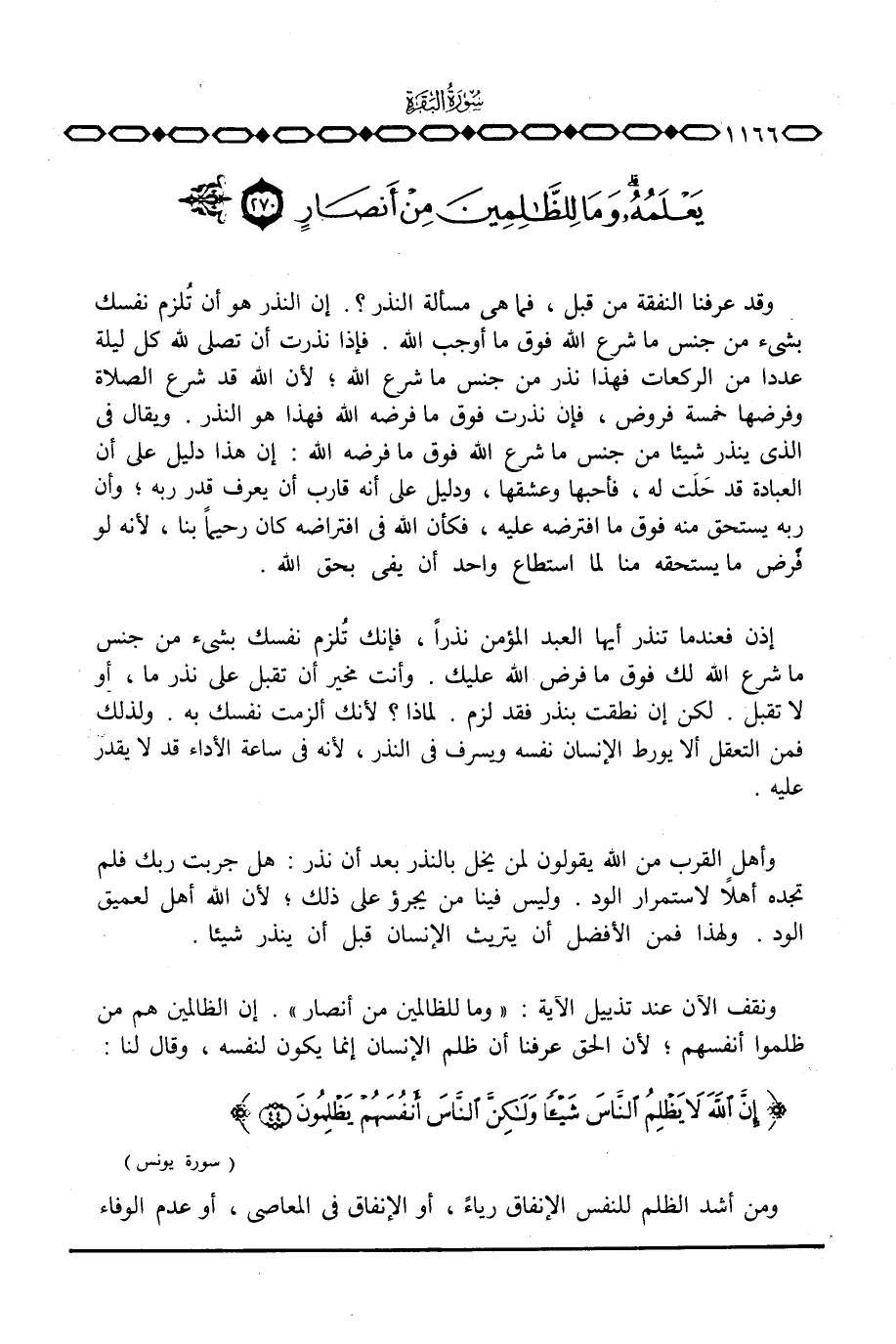 وقد عرفنا النفقة من قبل، فما هي مسألة النذر؟ . إن النذر هو أن تُلزم نفسك بشيء من جنس ما شرع الله فوق ما أوجب الله. فإذا نذرت أن تصلي لله كل ليلة عددا من الركعات فهذا نذر من جنس ما شرع الله؛ لأن الله قد شرع الصلاة وفرضها خمسة فروض، فإن نذرت فوق ما فرضه الله فهذا هو النذر. ويقال في الذي ينذر شيئا من جنس ما شرع الله فوق ما فرضه الله: إن هذا دليل على أن العبادة قد حَلَتَ له، فأحبها وعشقها، ودليل على أنه قارب أن يعرف قدر ربه؛ وأن ربه يستحق منه فوق ما افترضه عليه، فكأن الله في افتراضه كان رحيماً بنا، لأنه لو فرض ما يستحقه منا لما استطاع واحد أن يفي بحق الله.