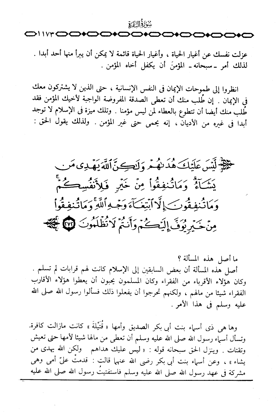أصل هذه المسألة أن بعض السابقين إلى الإسلام كانت لهم قرابات لم تسلم. وكان هؤلاء الأقرباء من الفقراء وكان المسلمون يحبون أن يعطوا هؤلاء الأقارب الفقراء شيئا من مالهم، ولكنهم تحرجوا أن يفعلوا ذلك فسألوا رسول الله صَلَّى اللَّهُ عَلَيْهِ وَسَلَّم َ في هذا الأمر.