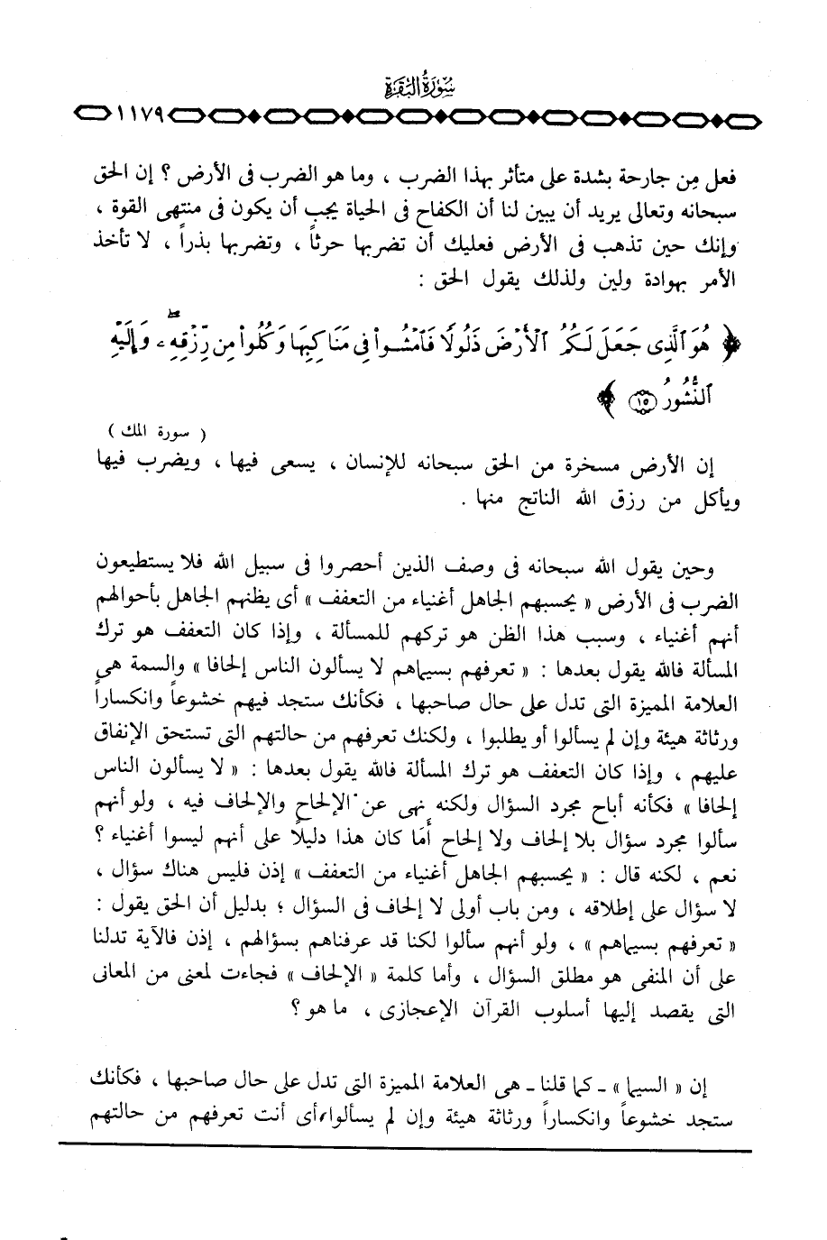 وحين يقول الله سبحانه في وصف الذين أحصروا في سبيل الله فلا يستطيعون الضرب في الأرض {يَحْسَبُهُمُ الجاهل أَغْنِيَآءَ مِنَ التعفف} أي يظنهم الجاهل بأحوالهم أنهم أغنياء، وسبب هذا الظن هو تركهم للمسألة، وإذا كان التعفف هو ترك المسألة فالله يقول بعدها: {تَعْرِفُهُم بِسِيمَاهُمْ لاَ يَسْأَلُونَ الناس إِلْحَافاً} والسمة هي العلامة المميزة التي تدل على حال صاحبها، فكأنك ستجد فيهم خشوعاً وانكساراً ورثاثة هيئة وإن لم يسألوا أو يطلبوا، ولكنك تعرفهم من حالتهم التي تستحق الإنفاق عليهم، وإذا كان التعفف هو ترك المسألة فالله يقول بعدها: {لاَ يَسْأَلُونَ الناس إِلْحَافاً} فكأنه أباح مجرد السؤال ولكنه نهى عن الإلحاحٍ والإلحاف فيه، ولو أنهم سألوا مجرد سؤال بلا إلحاف ولا إلحاح أَمَا كان هذا دليلاً على أنهم ليسوا أغنياء؟ نعم، لكنه قال: {يَحْسَبُهُمُ الجاهل أَغْنِيَآءَ مِنَ التعفف} إذن فليس هناك سؤال، لا سؤال على إطلاقه، ومن باب أولى لا إلحاف في السؤال؛ بدليل أن الحق يقول: {تَعْرِفُهُم بِسِيمَاهُمْ} ، ولو أنهم سألوا لكنا قد عرفناهم بسؤالهم، إذن فالآية تدلنا على أن المنفي هو مطلق السؤال، وأما كلمة «الإلحاف» فجاءت لمعنى من المعاني التي يقصد إليها أسلوب الإعجازي، ما هو؟