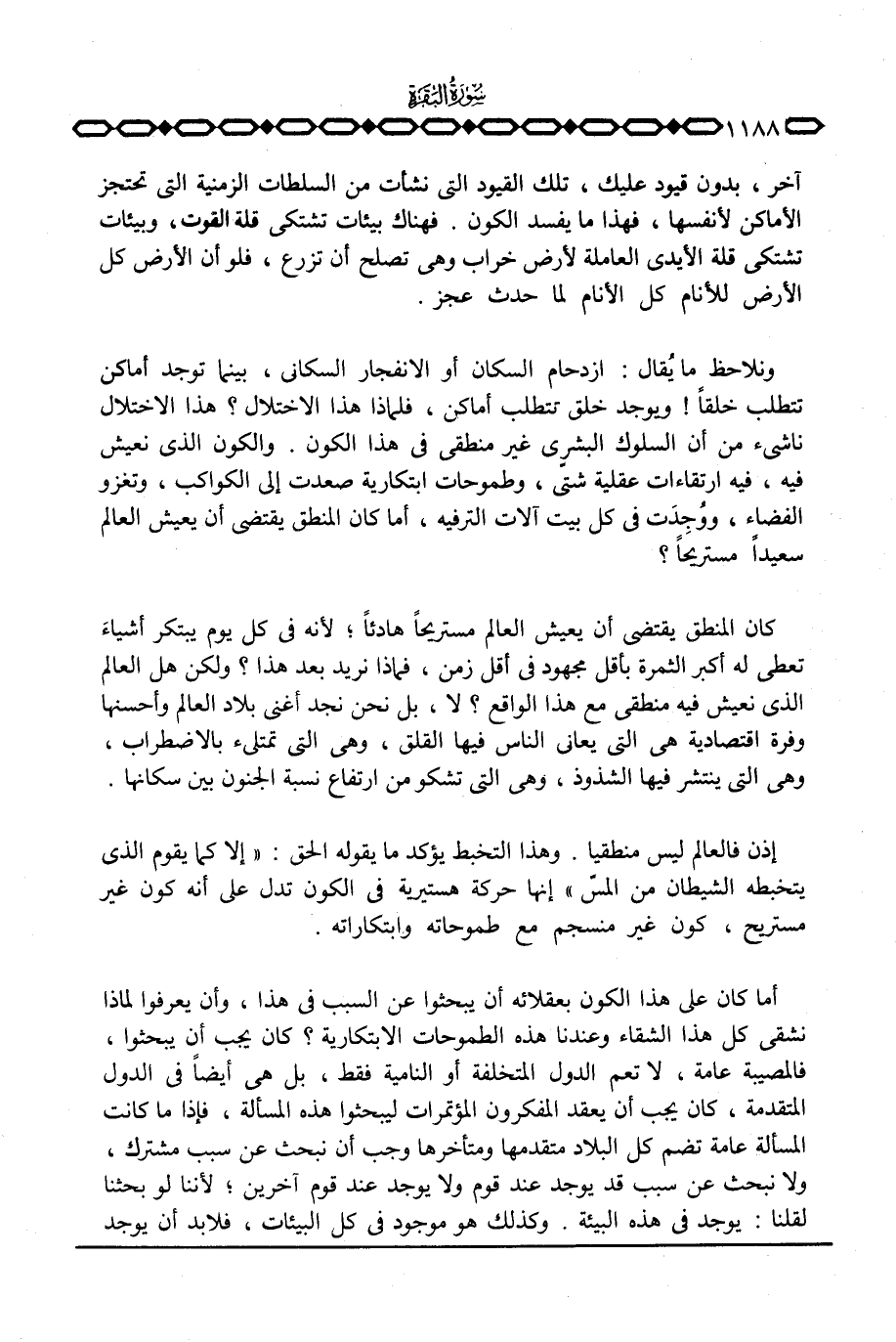 ونلاحظ ما يُقال: ازدحام السكان أو الانفجار السكاني، بينما توجد أماكن تتطلب خلقاً! ويوجد خلق تتطلب أماكن، فلماذا هذا الاختلال؟ هذا الاختلال ناشئ من أن السلوك البشري غير منطقي في هذا الكون. والكون الذي نعيش فيه، فيه ارتقاءات عقلية شتّى، وطموحات ابتكارية صعدت إلى الكواكب، وتغزو الفضاء، ووُجِدَت في كل بيت آلات الترفيه، أما كان المنطق يقتضي أن يعيش العالم سعيداً مستريحاً؟