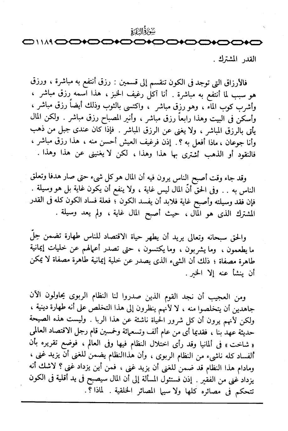 ومن العجيب أن نجد القوم الذين صدروا لنا النظام الربوي يحاولون الآن جاهدين أن يتخلصوا منه، لا لأنهم ينظرون إلى هذا التخلص على أنه طهارة دينية، ولكن لأنهم يرون أن كل شرور الحياة ناشئة عن هذا الربا. وليست هذه الصيحة حديثة عهد بنا، فقديما أي من عام ألف وتسعمائة وخمسين قام رجل الاقتصاد العالمي «شاخت» في ألمانيا وقد رأى اختلال النظام فيها وفي العالم، فوضع تقريره بأن الفساد كله ناشئ من النظام الربوي، وأن هذا النظام يضمن للغني أن يزيد غنى، وما دام هذا النظام قد ضمن للغني أن يزيد غنى، فمن أين يزداد غنى؟ لاشك أنه يزداد غنى من الفقير. إذن فستئول المسألة إلى أن المال سيصبح في يد أقلية في الكون تتحكم في مصائره كلها ولاسيما المصائر الخلقية. لماذا؟ .