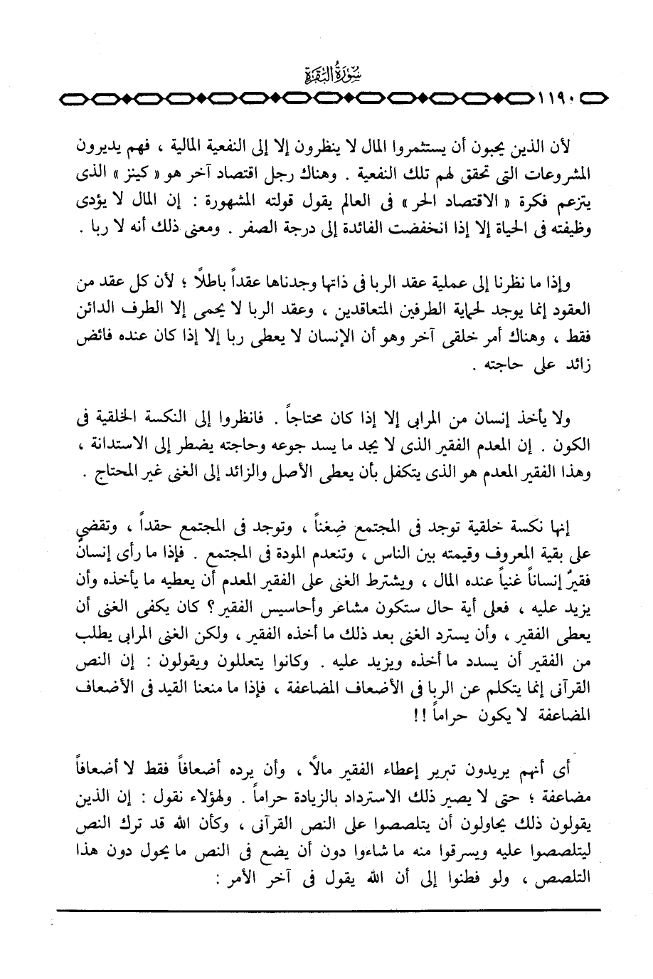 لأن الذين يحبون أن يستثمروا المال لا ينظرون إلا إلى النفعية المالية، فهم يديرون المشروعات التي تحقق لهم تلك النفعية. وهناك رجل اقتصاد آخر هو «كينز» الذي يتزعم فكرة «الاقتصاد الحر» في العالم يقول قولته المشهورة: إن المال لا يؤدي وظيفته في الحياة إلا إذا انخفضت الفائدة إلى درجة الصفر. ومعنى ذلك أنه لا ربا.