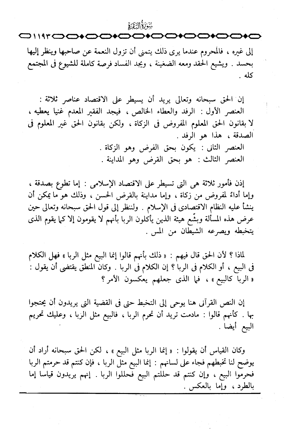 إذن فأمور ثلاثة هي التي تسيطر على الاقتصاد الإسلامي: إما تطوع بصدقة، وإما أداءٌ لمفروض من زكاة، وإما مداينة بالقرض الحسن، وذلك هو ما يمكن أن ينشأ عليه النظام الاقتصادي في الإسلام. ولننظر إلى قول الحق سبحانه وتعالى حين عرض هذه المسألة وبشّع هيئة الذين يأكلون الربا بأنهم لا يقومون إلا كما يقوم الذي يتخبطه ويصرعه الشيطان من المس.