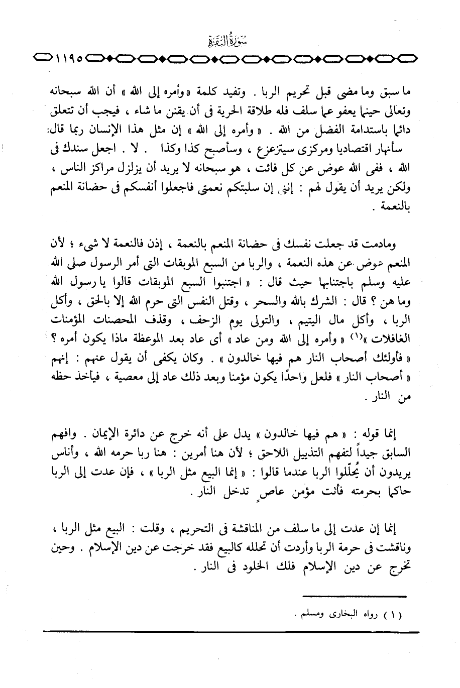 إنما إن عدت إلى ما سلف من المناقشة في التحريم، وقلت: البيع مثل الربا، وناقشت في حرمة الربا وأردت أن تحلله كالبيع فقد خرجت عن دين الإسلام. وحين تخرج عن دين الإسلام فلك الخلود في النار.