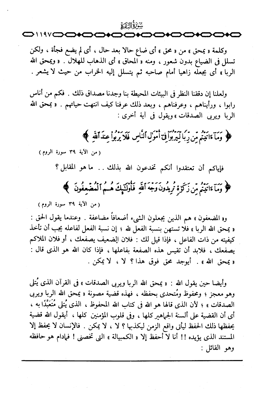 وأيضا حين يقول الله: {يَمْحَقُ الله الربا وَيُرْبِي الصدقات} في القرآن الذي يُتلى وهو معجز؛ ومحفوظ ومُتحدي بحفظه، فهذه قضية مصونة {يَمْحَقُ الله الربا وَيُرْبِي الصدقات} ؛ لأن الذي قالها هو الله في كتاب الله المحفوظ، الذي يُتلى مُتَعَبِّداً به، أي أن القضية على ألسنة الجماهير كلها، وفي قلوب المؤمنين كلها، أيقول الله قضية يحفظها ذلك الحفظ ليأتي واقع الزمن ليكذبها؟ لا، لا يمكن. فالإنسان لا يحفظ إلا المستند الذي يؤيده! {أنا لا أحفظ إلا «الكمبيالة» التي تخصني} فما دام هو حافظه وهو القائل: